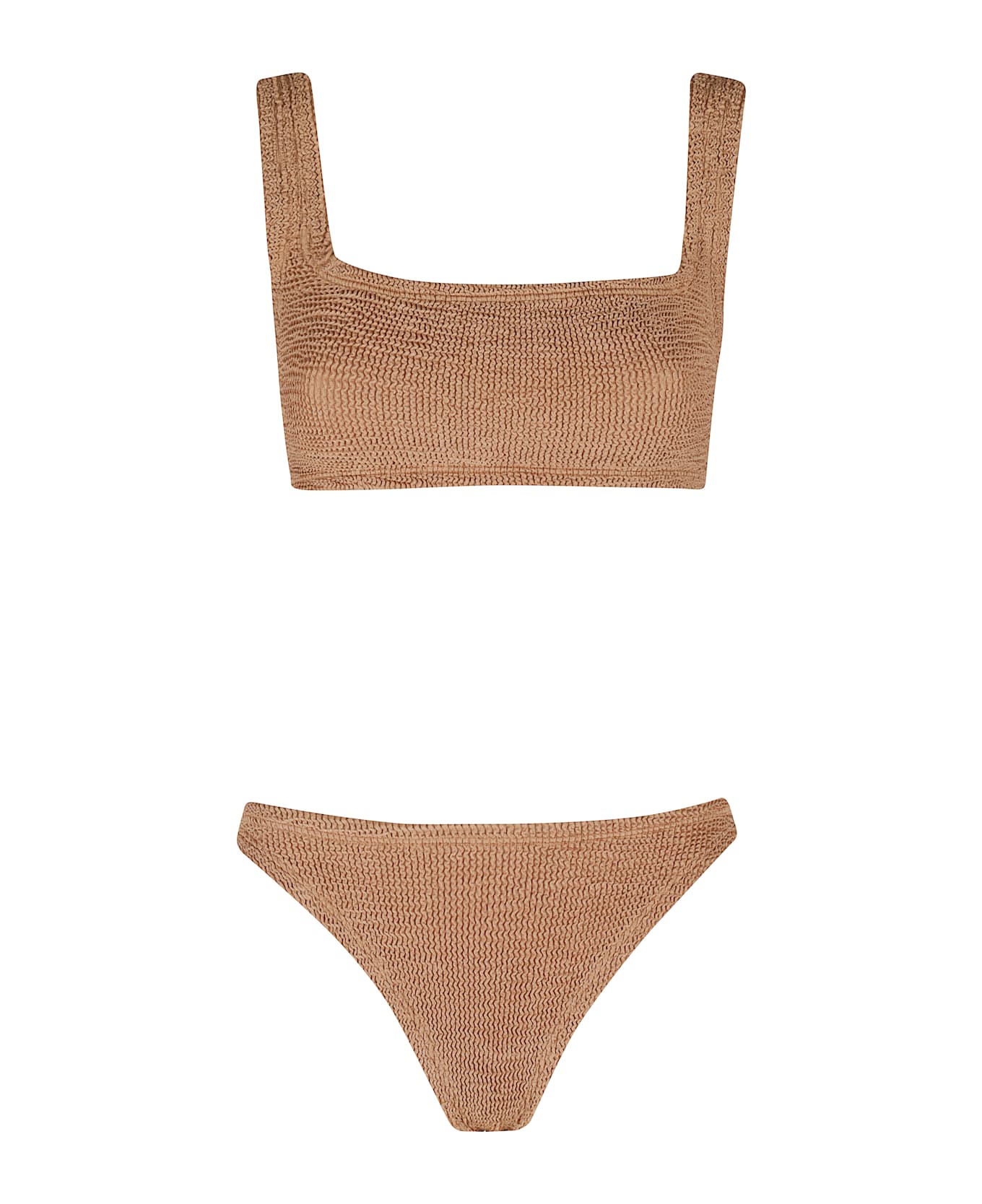 Xandra Bikini - Hunza G - Metallic cocoa color - Crinkle fabric - Bandeau top with straps - Strapless briefs