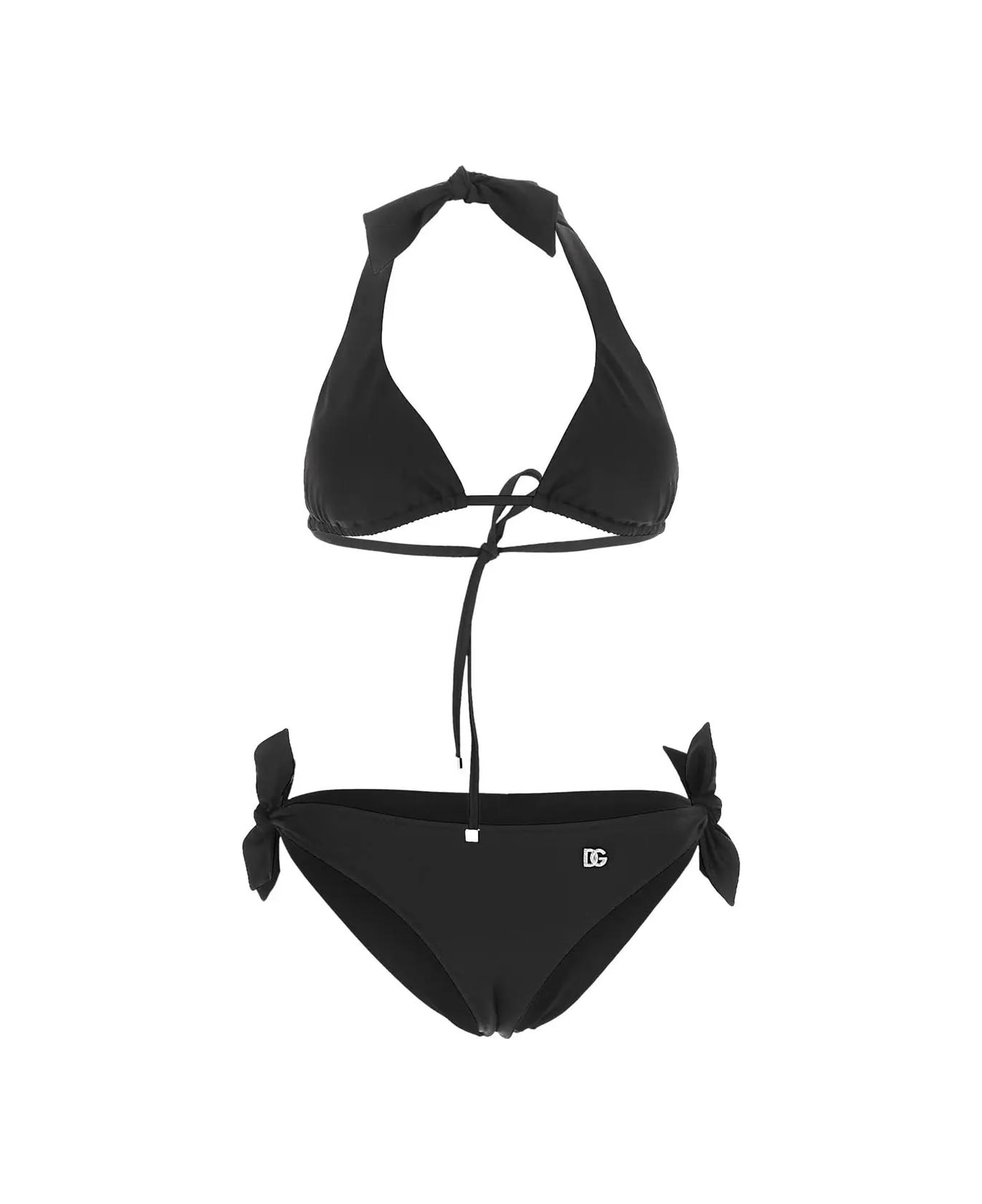 Dolce & Gabbana bikini in black polyamide with padded triangle top, self-tied straps behind the neck and back, metallic aglets, removable padding, slip with adjustable ties and metallic monogram embellished with crystals and matching PVC pouch. Composition: 80% Polyamide; 20% Elastane