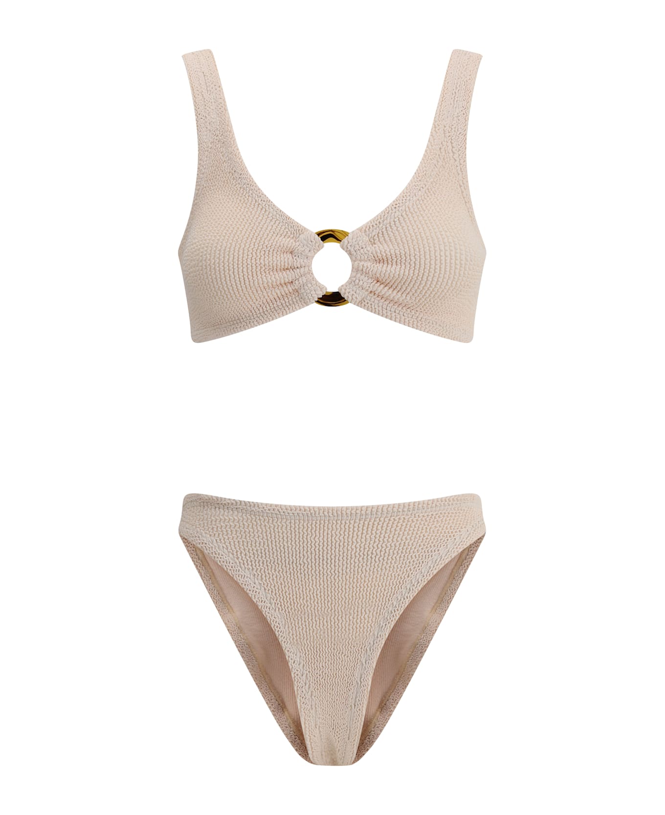 Hunza g's julia swimsuit is ideal for those seeking a sophisticated, modern look. the bikini style consists of a low-rise bottom and an off-the-shoulder top, enhanced by a cut-out detail with a tortoiseshell ring on the front, which adds a distinctive style touch. the unique original crinkle fabrication allows the fabric to stretch to flex, sculpt and support every curve, fitting all body types perfectly, ensuring a unique fit.