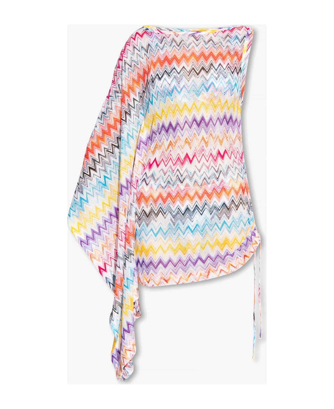 Multicolored asymmetric beach dress from Missoni. Decorated with the brand's signature a zig-zag pattern, this round neck design fastens with decorative drawstrings on the sides.