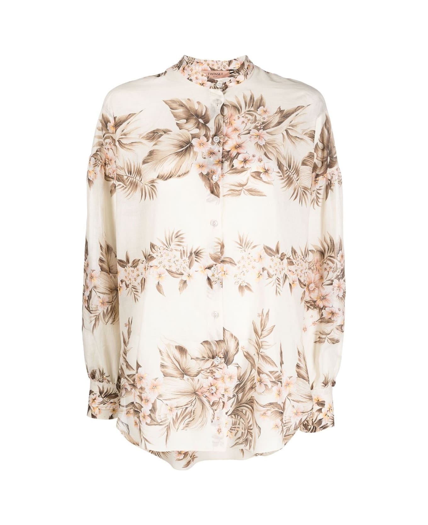 Blouse With All-over Floral Print In White And Beige Cotton Woman