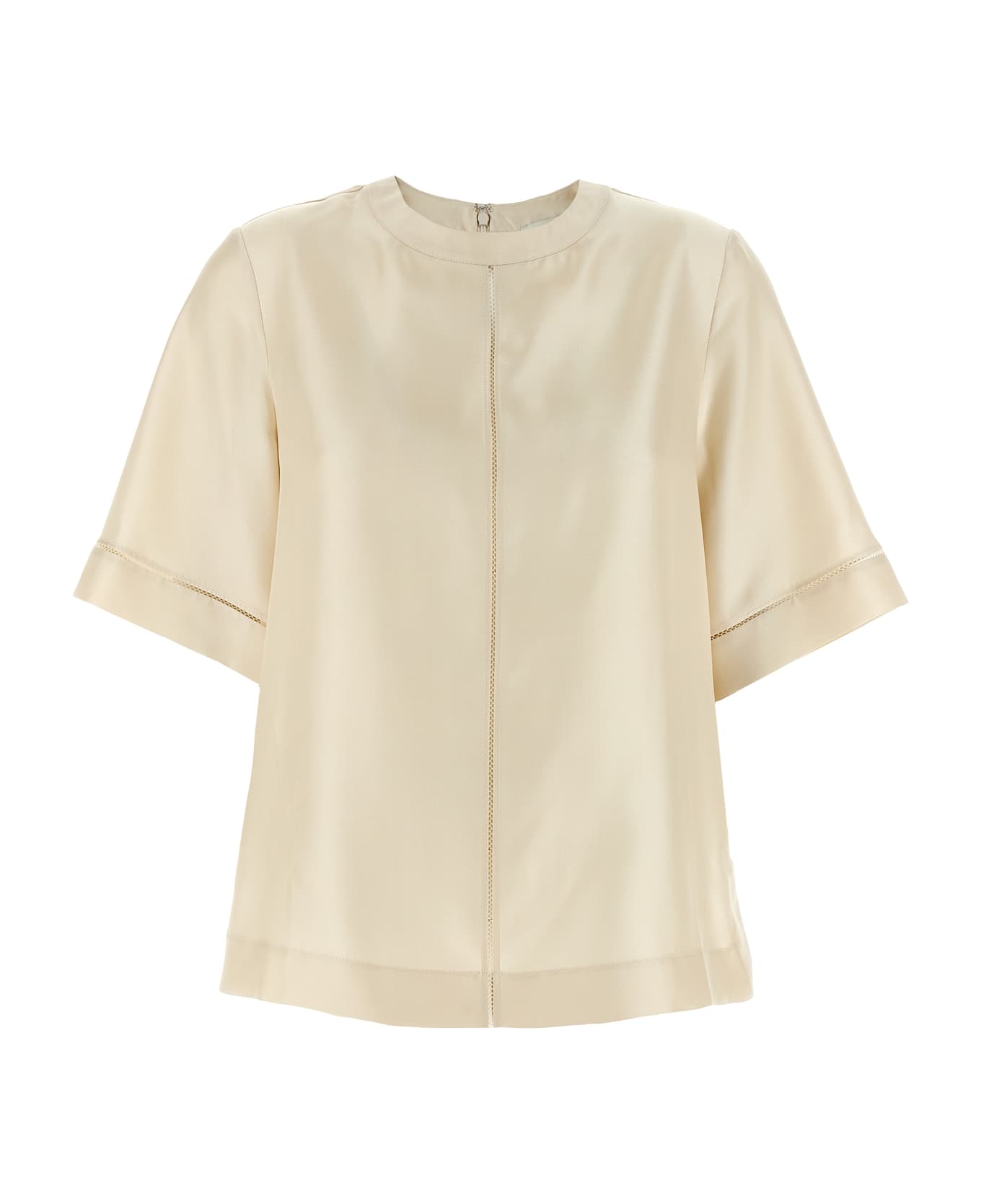 'Havana' silk twill top with lace stitch inserts, crew neck, back zip closure, wide short sleeves, side slits.