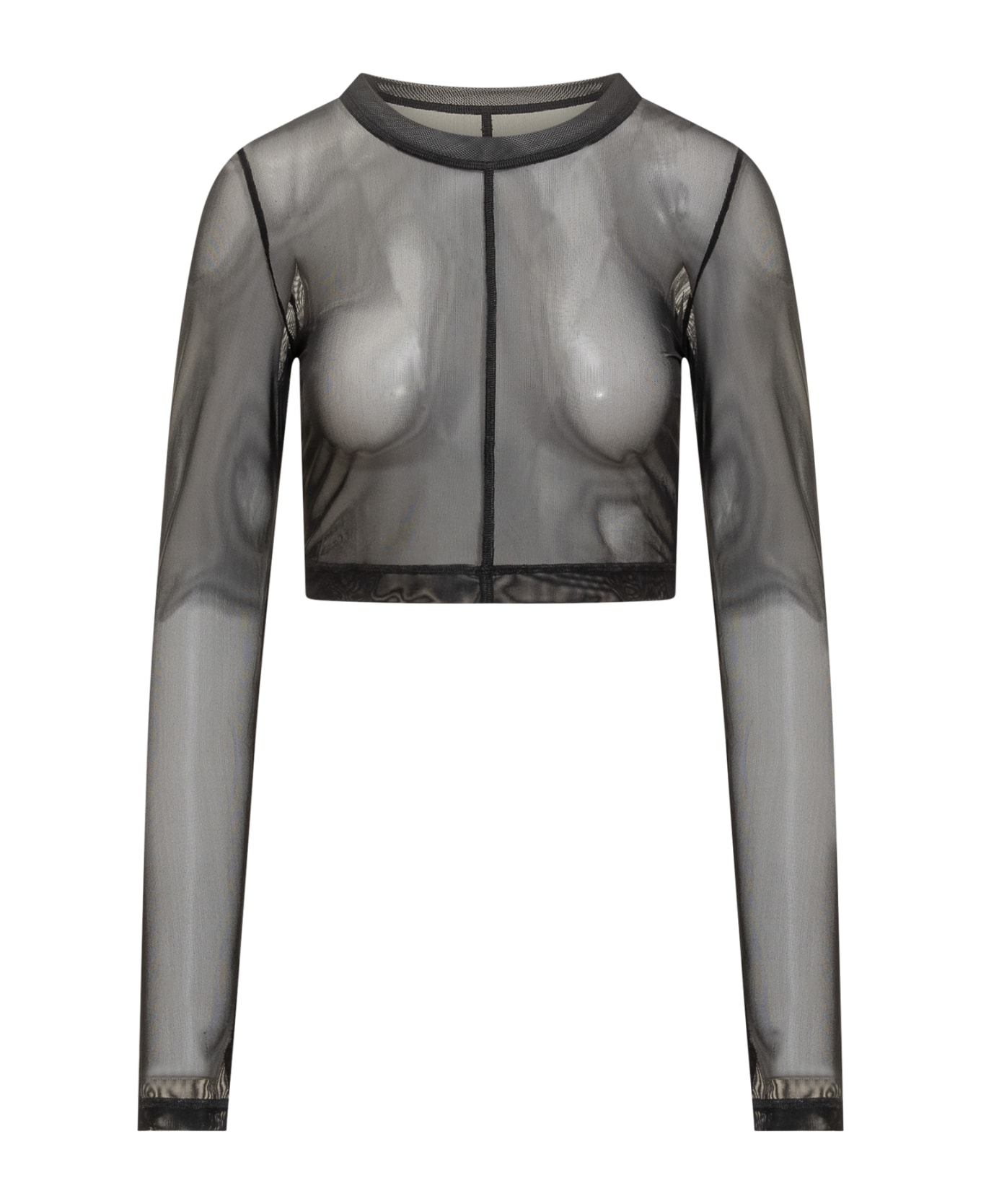 Cropped top with long sleeves. Crew neck. Transparent and stretch knit. Tulle workmanship. Label re-edition applied on the sleeve. Kim Kardashian Collection. Composition: 92% Polyamide, 8% Elastane