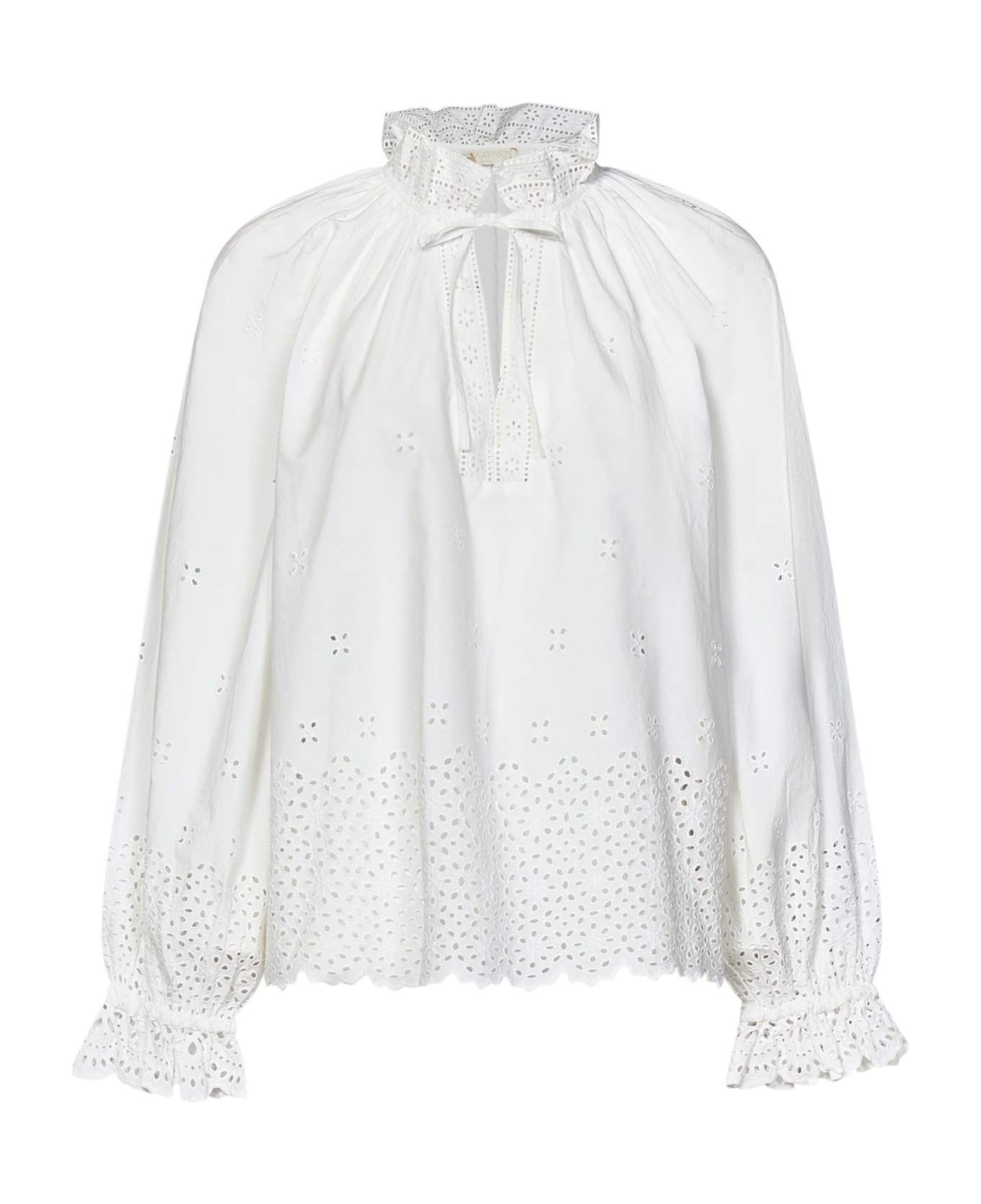 Composition: Alora White Water-washed Poplin Blouse With Bold Geometric Eyelets.