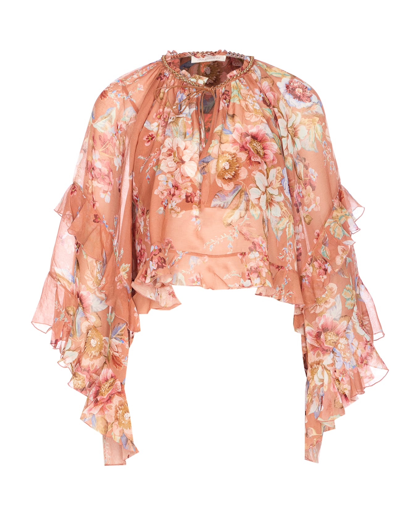 Zimmermann cinnamon Awaken ruffle blouse, bra detail with hook closure, floral print, rouches details