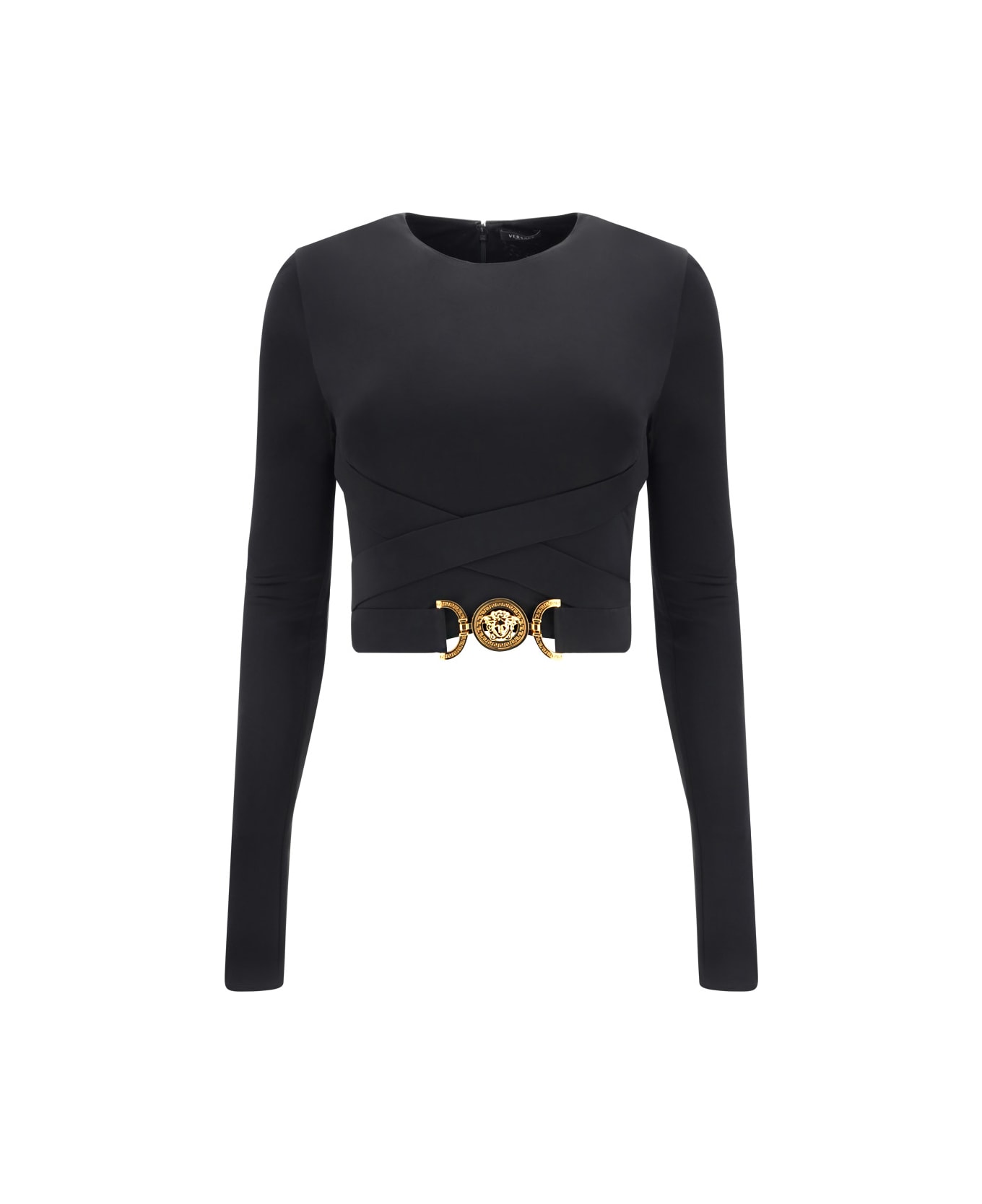 Blouse top by gianni versace, stretch design, cropped model, round neck with invisible back zip fastening, matching sash fastening at waist, front fastening with maxi round buckle with iconic gold-plated medusa head, extra long sleeves.