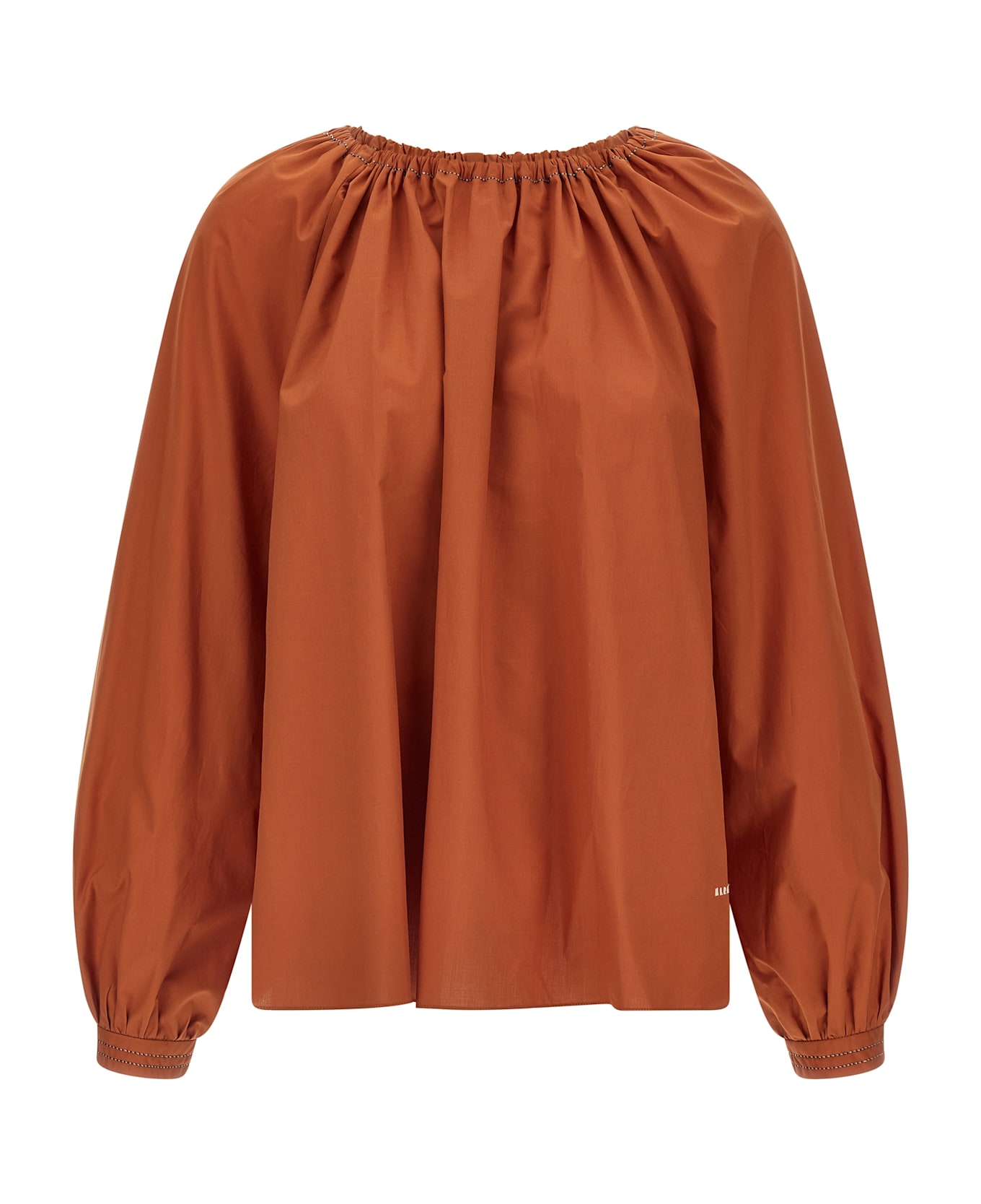 Cotton poplin blouse, wrinkled and modular boat neckline with back drawstring and cut-out teardrop detail, front logo embroidery, flared silhouette, long wide raglan sleeves with cuffs. Composition: 100% cotton