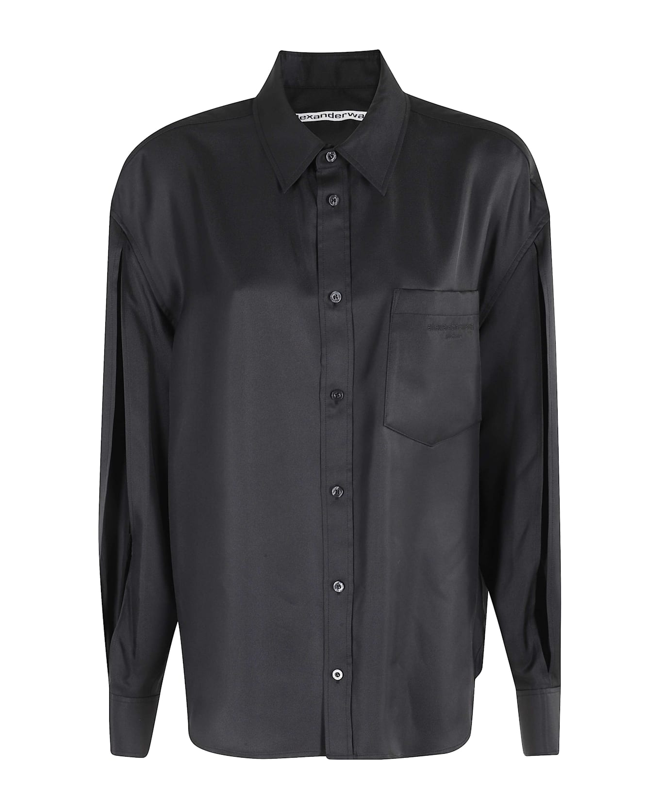 Shirt - Alexander Wang - Black color - Lapel collar - Front flap with buttons - Pure silk fabric - Cropped sleeves - Pocket with tone on tone logo embroidery - Cuffs with tower closure - Button closure