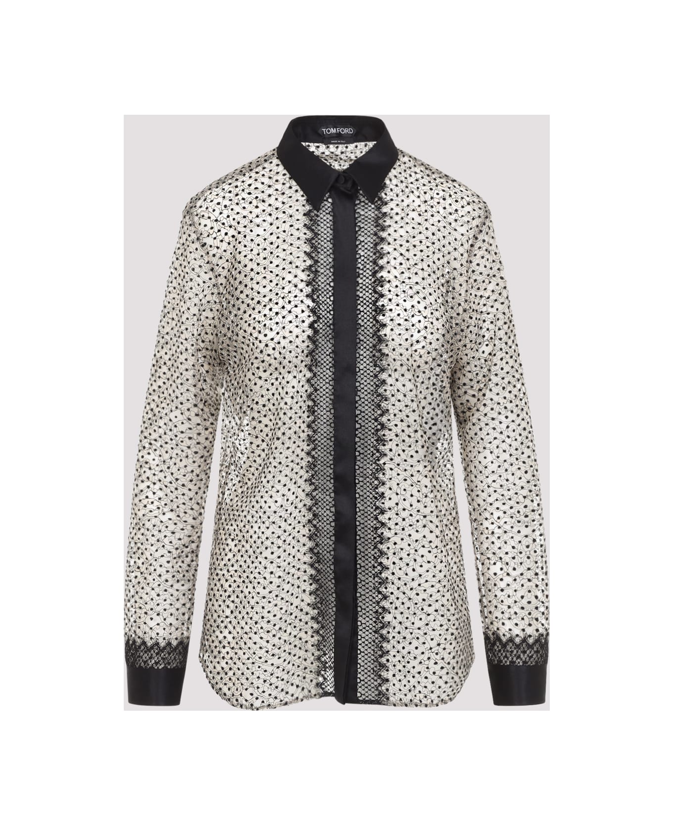 Tom Ford Nude Beige Flock Polka Dot Shirt. Crafted in polyamide and polyester blend. Black pointed collar, front concealing buttoned fastening, long sleeves, contrasting black buttoned cuffs, round hem. Nude beige background with contrasting black lace design all-over.