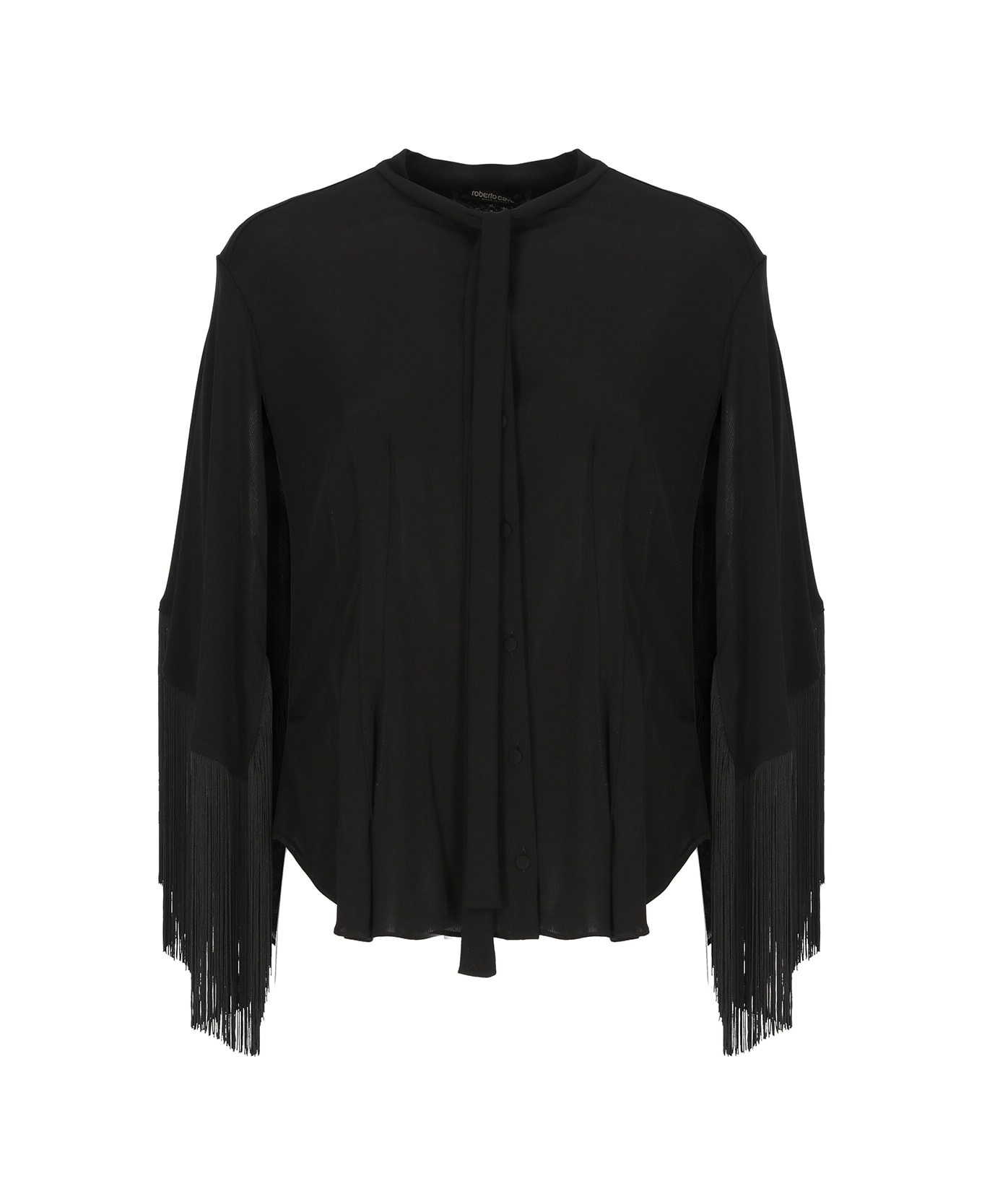 - Black Roberto Cavalli shirt for woman - Crewneck with self-tie laces - Front buttons fastening - Long sleeves with velt and fringes
