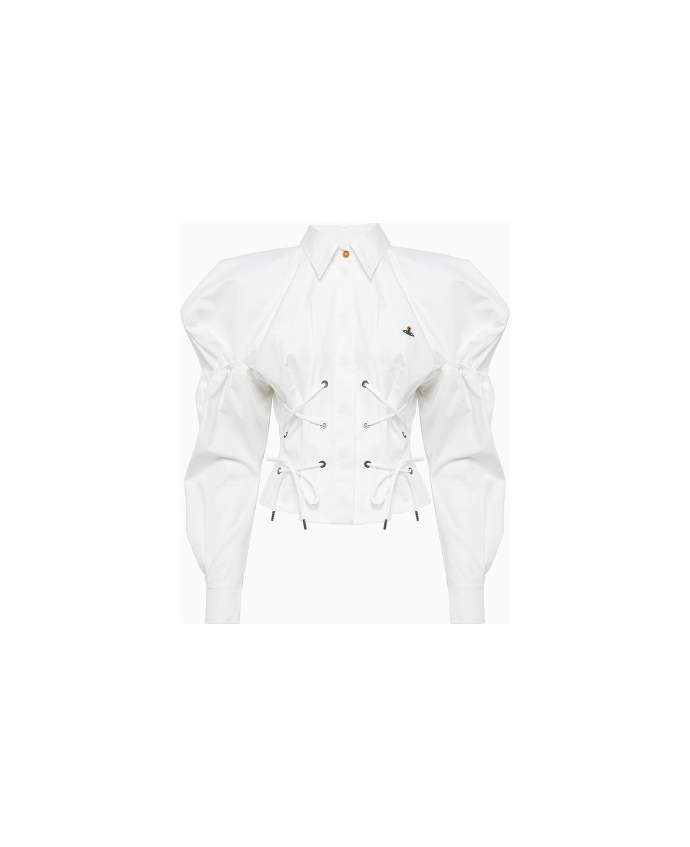 Made in Italy solid color cotton shirt. Classic collar. Maxi puffy sleeves with ruffles. Corset-style string closure at front. Iconic Orb embroidery logo at chest. Long sleeves, buttoned cuffs. Rounded hem. Slim fit. COMPOSITION: 100% COTTON. Composition: