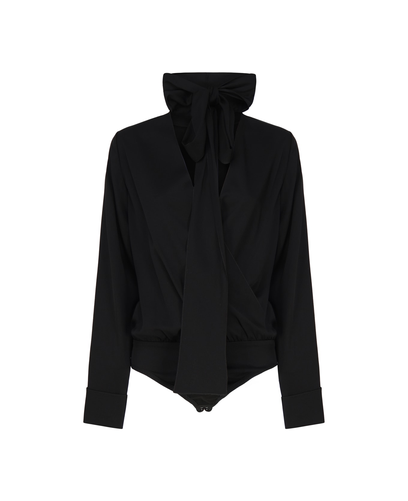-Shirt with a body construction -Neckline is deep with scarf on the neckline -Fit is soft -Long sleeves and important cuffs with covered buttons -Made in Italy -Colour: Black