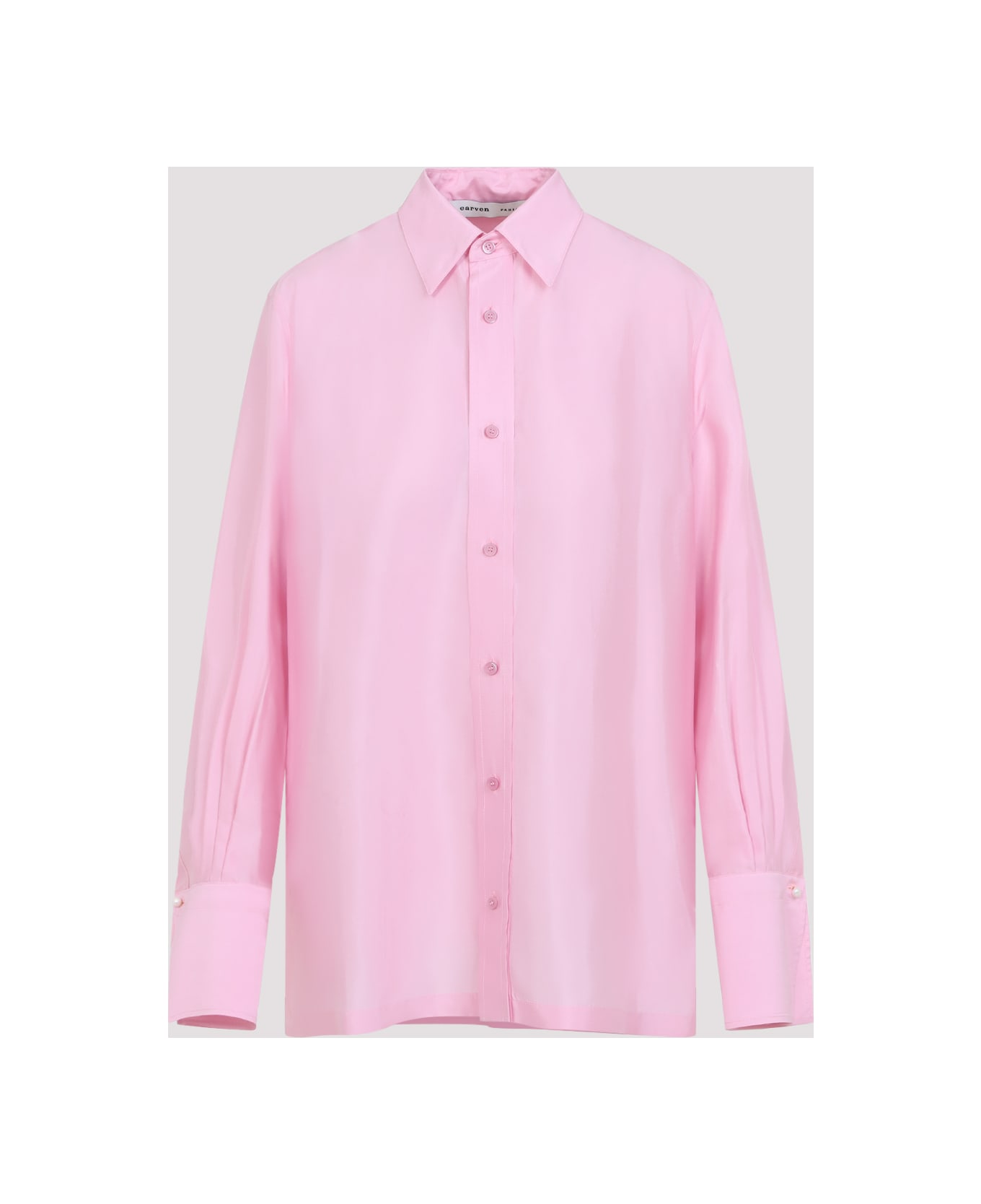 Carven Pink Silk Shirt. Crafted from pink silk, featuring a pointed collar, a front button fastening, long sleeves with pleated details, buttoned cuffs, fine pearl detailing at the back of the collar, a back yoke with an oversized box pleat, and a straight hem.