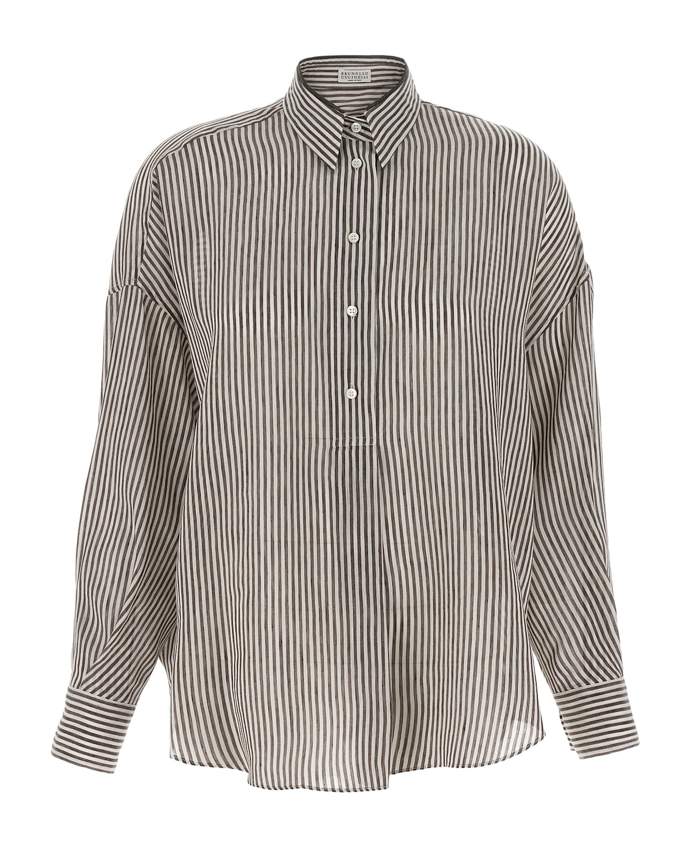 Striped cotton and silk blend shirt, pointed collar with jewel detail, front opening with buttons, side slits, long sleeves with cuffs. Composition: 78% linen, 22% silk