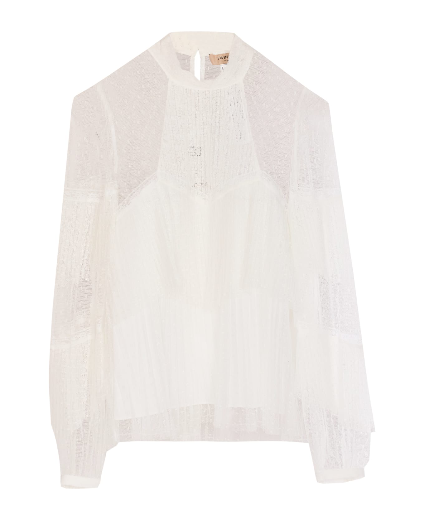 Twinset white shirt, high neck, buttons closure on the back, long sleeves, tulle, button on cuffs, mini plaque logo on the back Composition: 100% Polyester