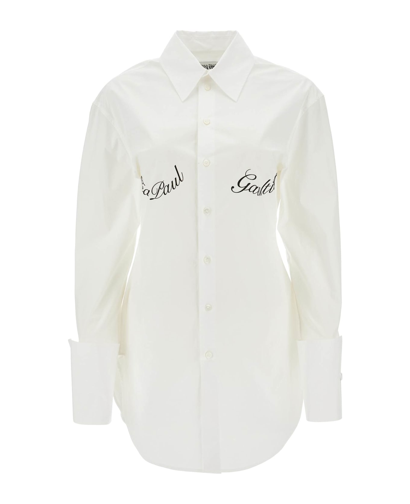 The women's shirt by Jean Paul Gaultier in stretch poplin offers contemporary elegance with a classic collar, long sleeves, and underboob print. Perfect from day to evening for a bold look.