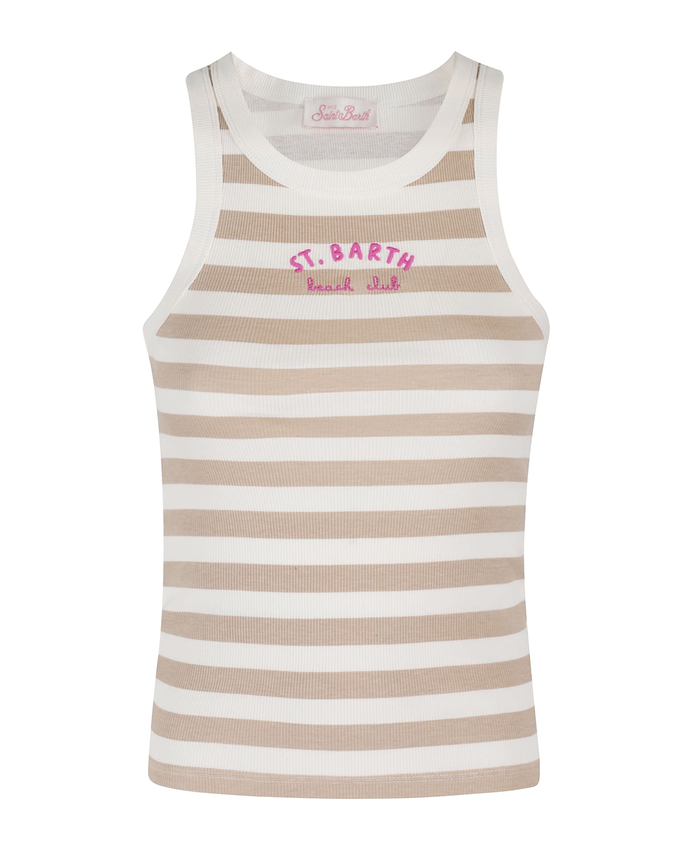 Ada tank top - MC2 Saint Barth - White and beige color - Ribbed cotton fabric with striped pattern - Crew neck - Contrasting embroidered logo lettering - Tight fit