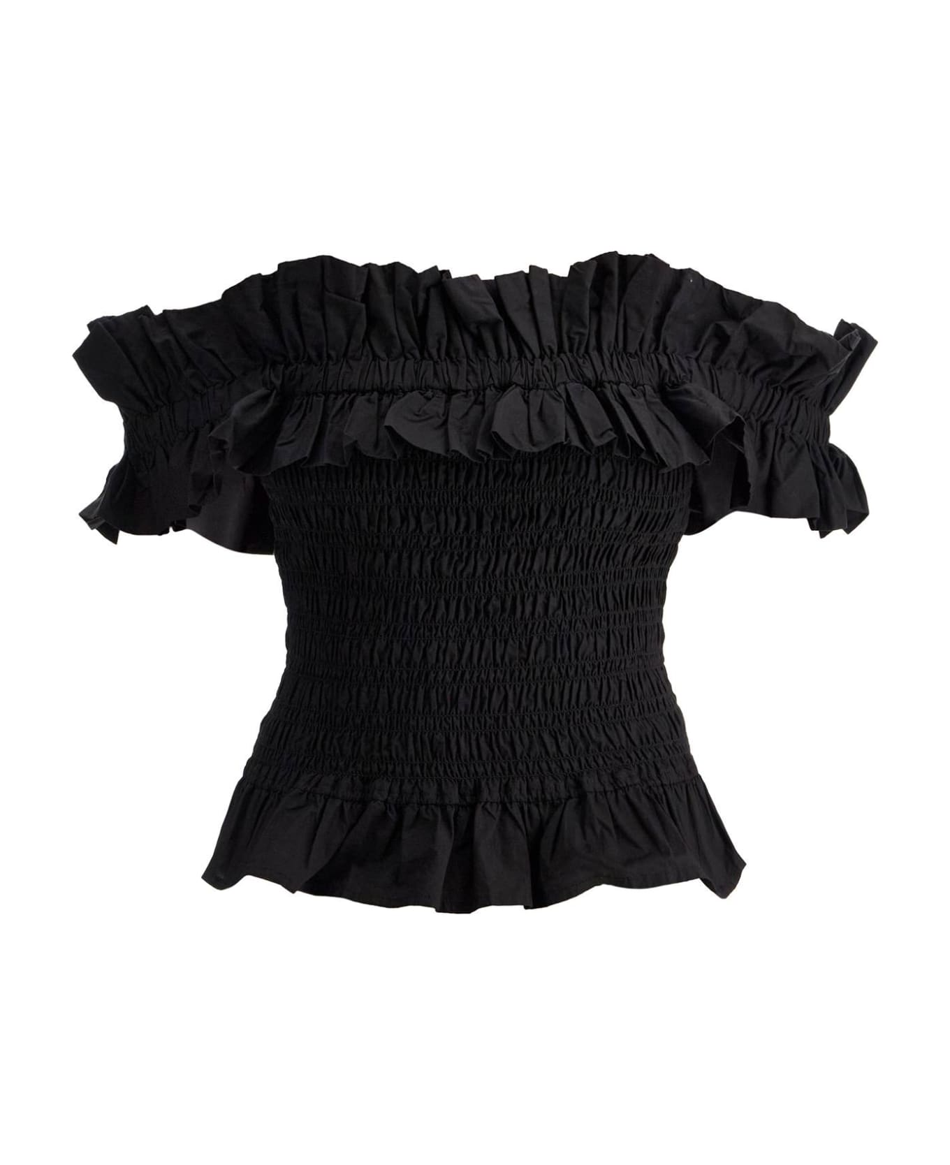 Made from organic cotton poplin, this Ganni crop top features a fitted smocked design and a straight neckline with an elasticized ruffle detail on the shoulders. The same detail is repeated at the hem. The model is 177 cm tall and wears a size EU 34. Composition: 100%CO-O