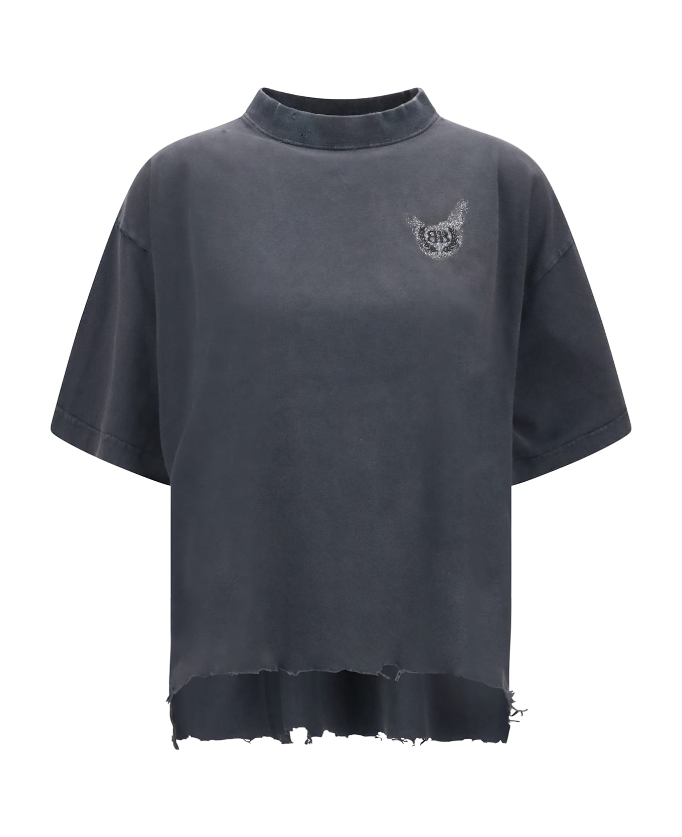 Balenciaga's cotton t-shirt is a bold, modern piece that combines comfort and contemporary style. the cropped design with ribbed crew neck offers a chic and dynamic fit. the iconic embroidered logo on the front adds a recognizable touch, while the glitter monogram print on the back panel gives a bright and original effect. the destroyed treatment gives the t-shirt a worn-in look, adding a distinctive, urban character to the look.