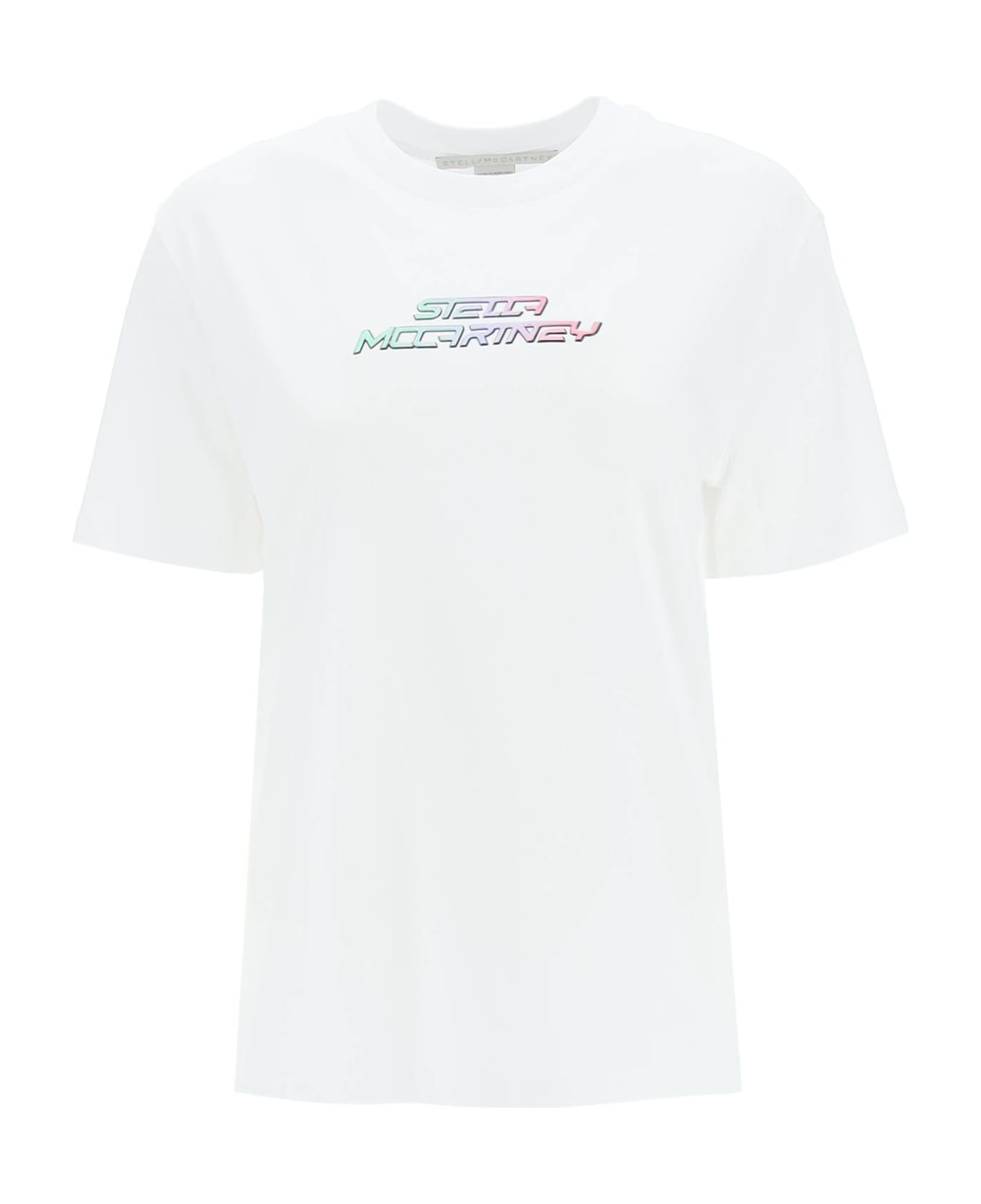 Stella McCartney t-shirt made of sustainable cotton with a regular straight cut, detailed with multicolor gel logo applied on the front. The model is 177 cm tall and wears a size IT 38. Composition: 100% cotone