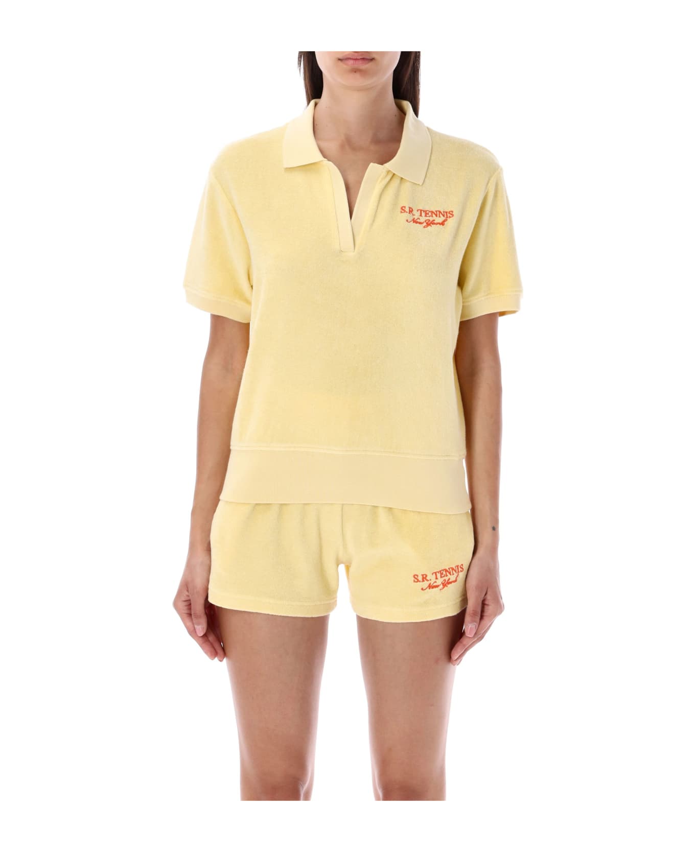 Sr Sport Ss Terry Polo By Sporty&rich. Featuring: V-neck Point Collar Short Sleeves Embroidered Logo At Chest Ribbed Hem Plain Back Model Is 1,72 M Tall And She Is Wearing Size S