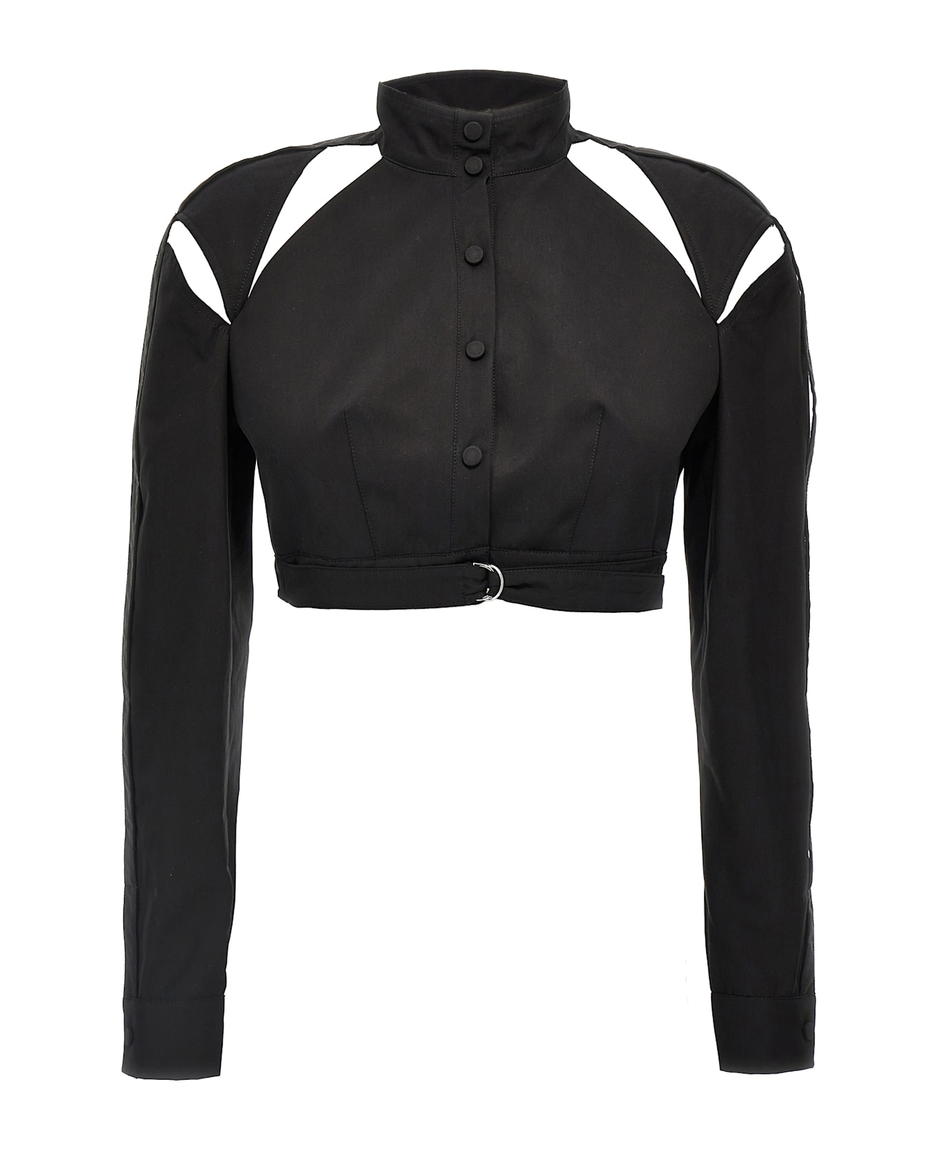 Cropped top in crepe de chine silk blend, cut-out details on shoulders, long cuffed sleeves, snap button closure, adjustable belt appliqué. Composition: 76% acetate, 24% silk