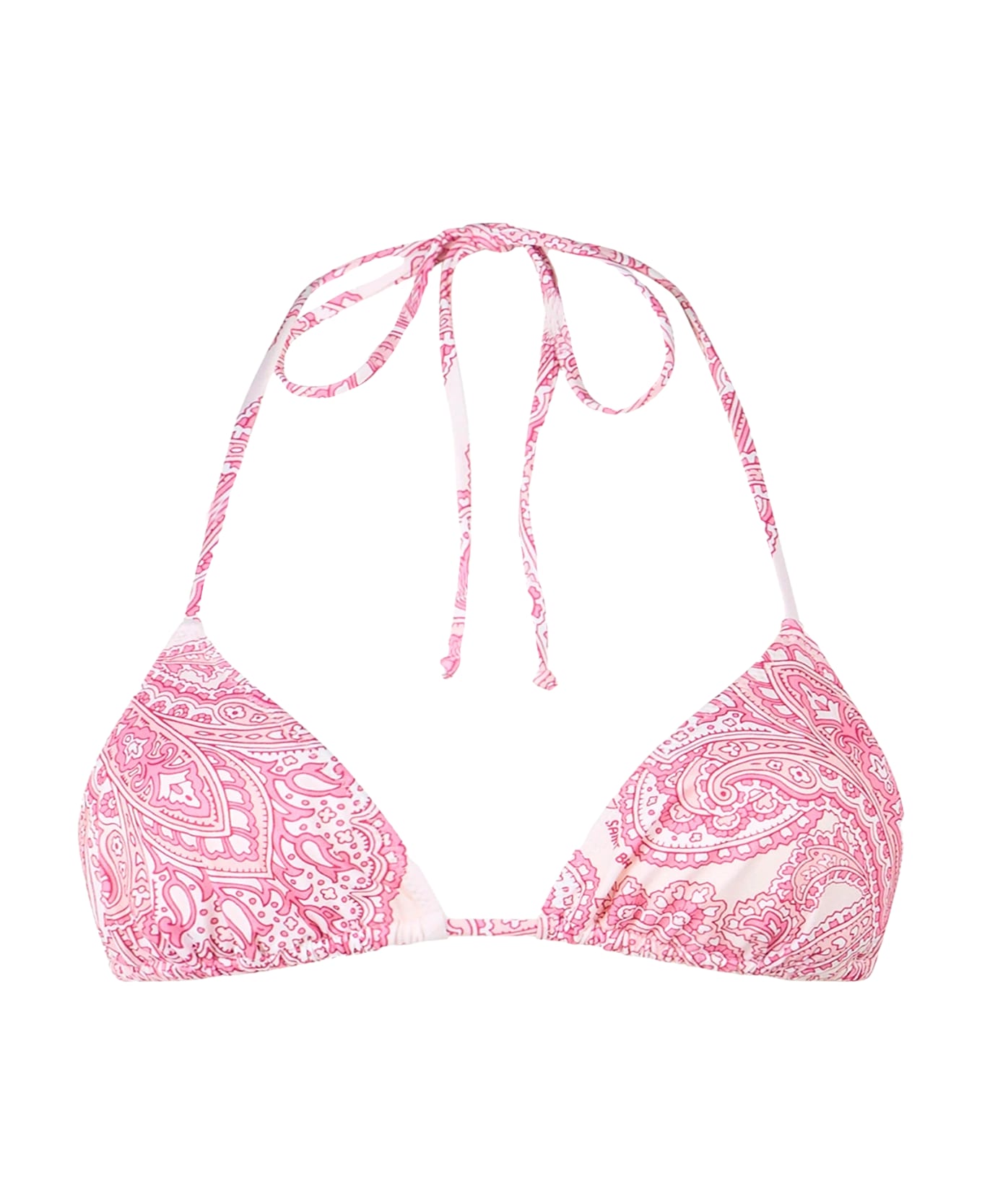 Timeless in design, this sliding triangle top swimsuit on a thin strap is a summer wardrobe essential. Its slender and versatile straps can be worn straight or tied behind the neck, ensuring a customized fit for your tan Sliding triangle top swimsuit on a thin strap Thin straps to tie behind the neck or straight Removable cups Pink paisley all over print Composition: 80% polyester 20% elastan