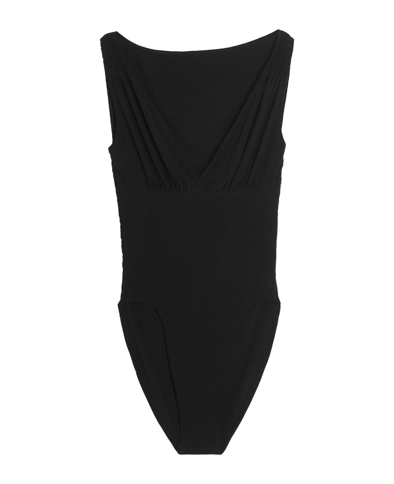 'Tara' bodysuit in stretch fabric with plunge V-neck and draping. Composition: 95% polyester 5% elastane