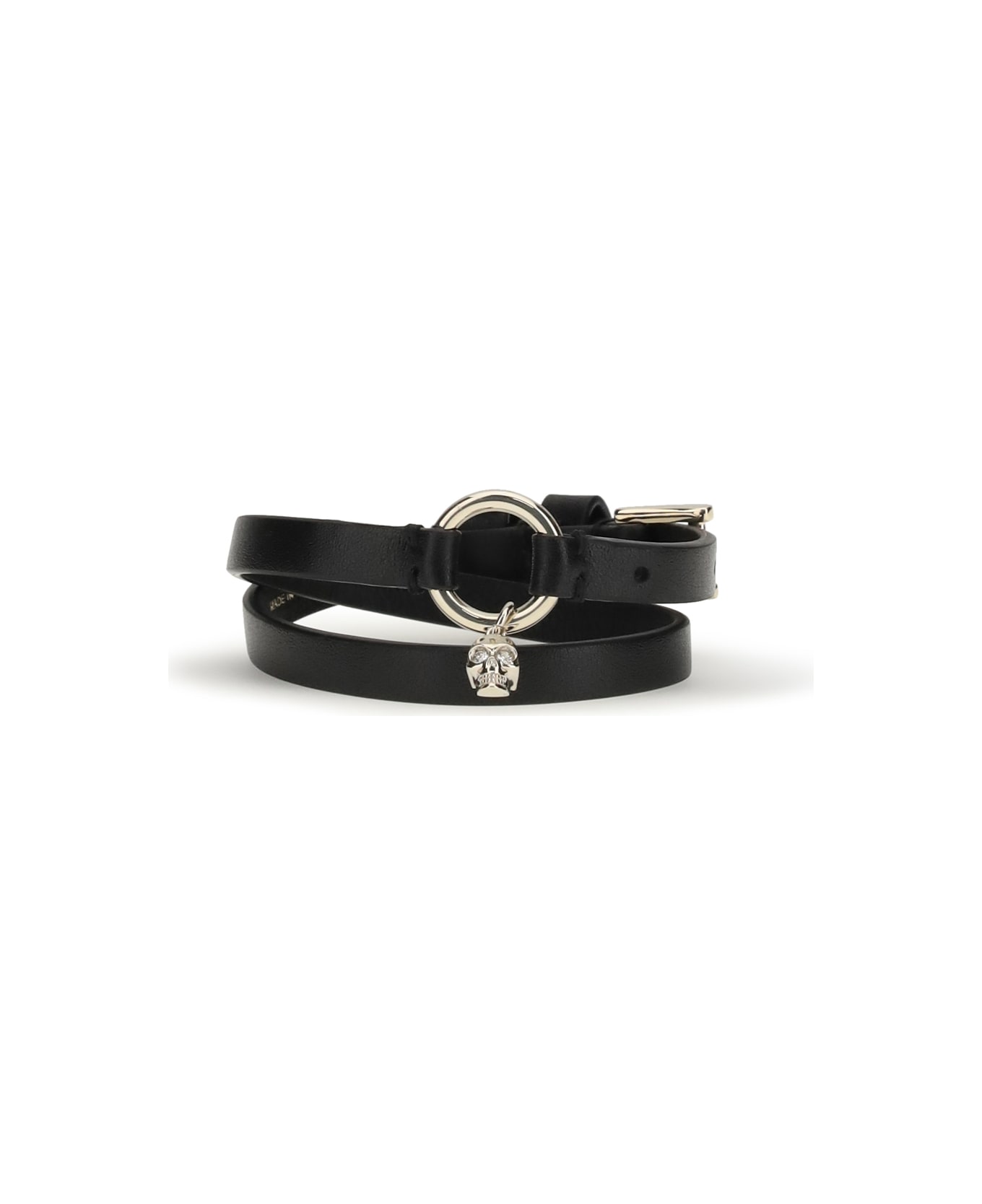 The skull ring double wrap bracelet by alexander mcqueen is crafted in leather and defined by a bold double-wrap design. pale gold-finish brass hardware enhances the piece, while the hanging skull charm adds an iconic statement detail. the adjustable buckle fastening ensures a secure, customizable fit, finished with the foiled alexander mcqueen logo on the inside. Composition: 100% % Calf Leather Bos Taurus