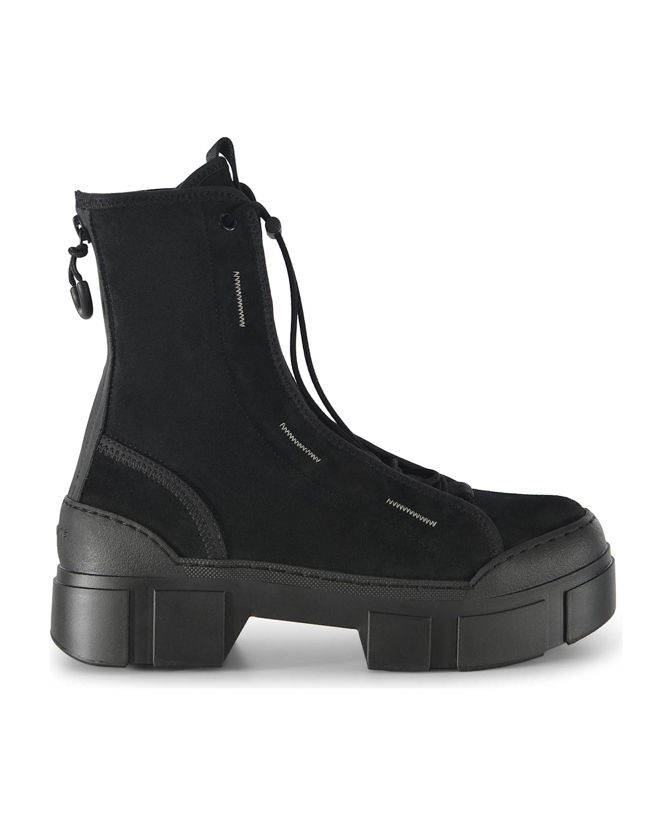 Ankle boots Vic Matié "Roccia" made of Black calfskin split leather. Contrasting White zigzag details on the sides. Round toe. Patch applied on the tongue. Adjustable drawstring closure. Zip closure, back. Rubber logo puller. Engraved logo lettering on the back. Rubber sole. Heel height, flat. Heel 4. 5cm, Height 18. 5cm, Sole 3. 5cm Sole 100% Rubber 100% Leather Made in Italy