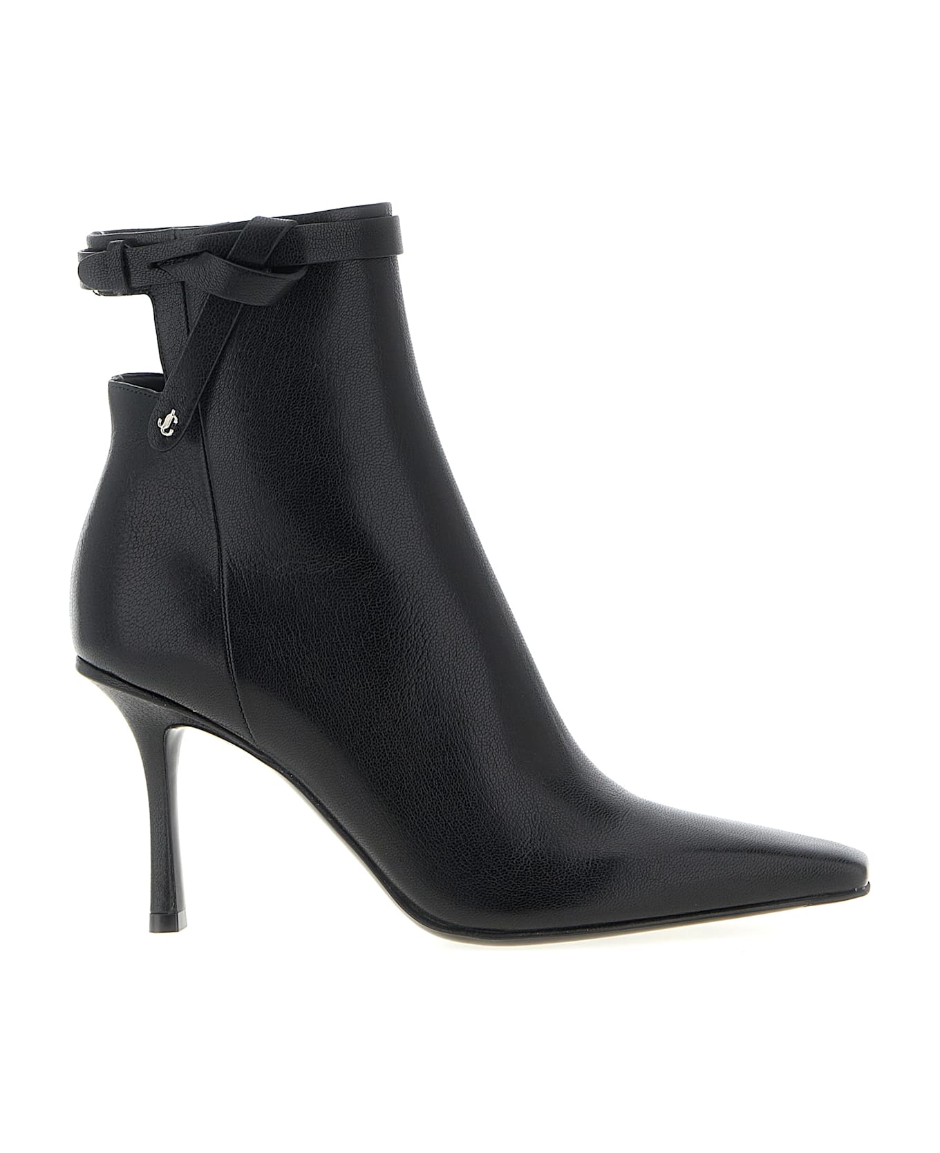 'Camie' shiny kidskin leather ankle boots with square toe, back cut-out detail with strap, side zip closure, stiletto heel, leather sole. Composition: 85% lh 6% me 5% sa 4% pl