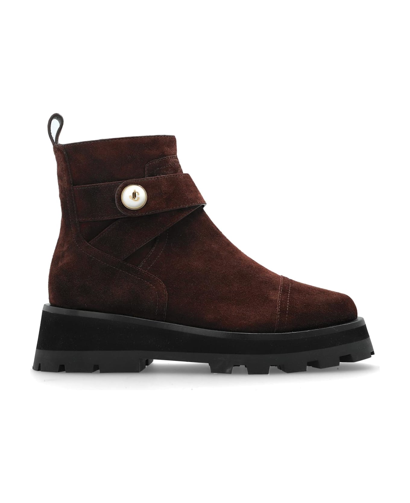 The 'Meena' Ankle Boots by Jimmy Choo capture the quintessence of modern urban chic, blending refined heritage with sophisticated flair. Crafted from premium brown suede with a luxuriously soft texture, this pair epitomizes exquisite craftsmanship and understated elegance. The design features a timeless, elongated silhouette with a rounded toe and a bold, grooved sole that provides distinctive urban character and superior comfort. Minimalist in presence but meticulously detailed, these boots feature subtle contrast stitching and a unique strap fastened by a large, pearl-inspired button adorned with a delicate gold accent. The side zipper in coordinated gold elegantly streamlines the fit, while the iconic designer logo, discreetly embossed into the supple leather insole, signals unmistakable pedigree. Why choose this product? Unparalleled Italian craftsmanship and sophisticated materials Innovative, urban-inspired sole for superior style and comfort Hand-finished details with a signature gold and pearl-accented strap Timeless, minimalist silhouette by a renowned fashion house Effortless fit with an elegant, gold-tone side zipper