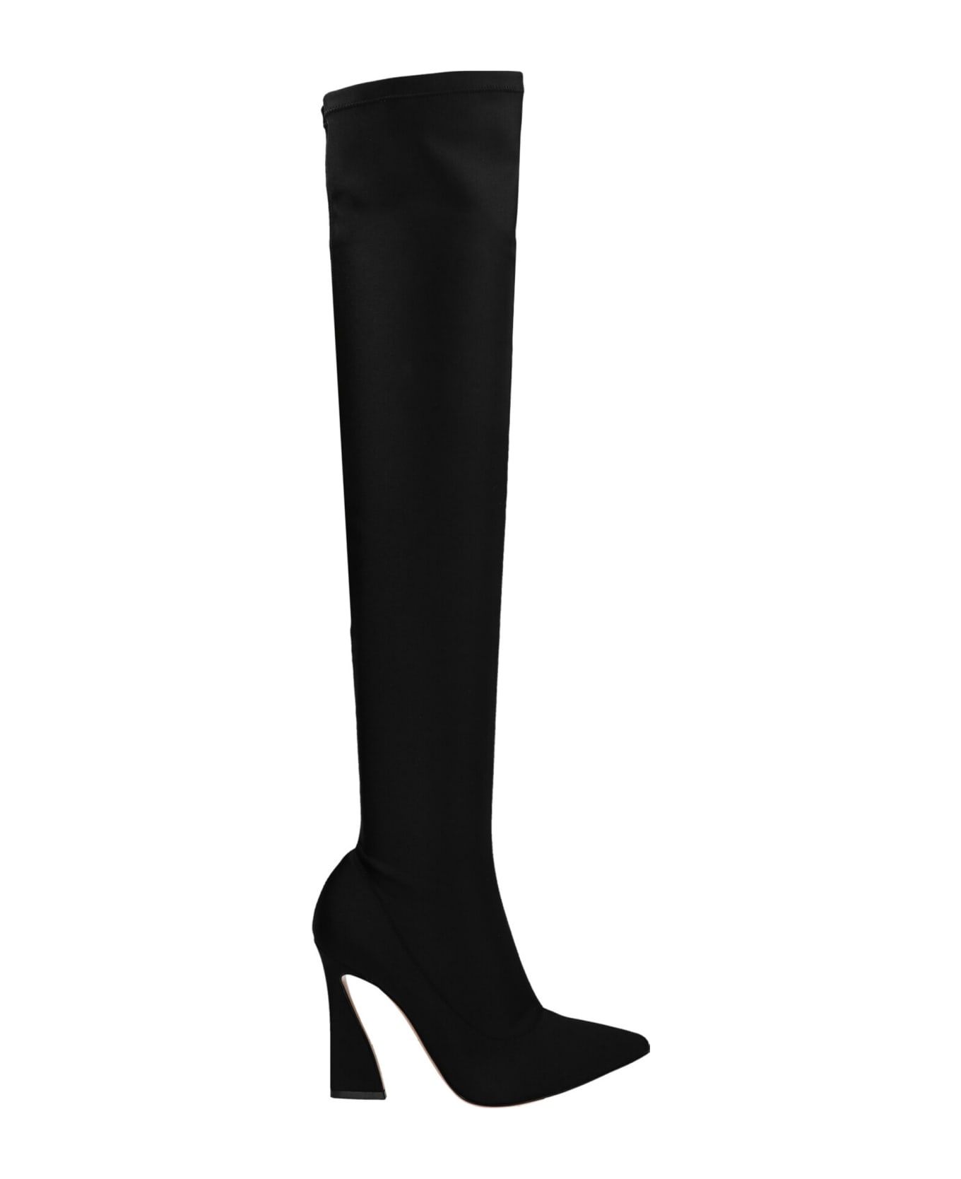 Lycra high boots with pointed toe and sculpted heel.