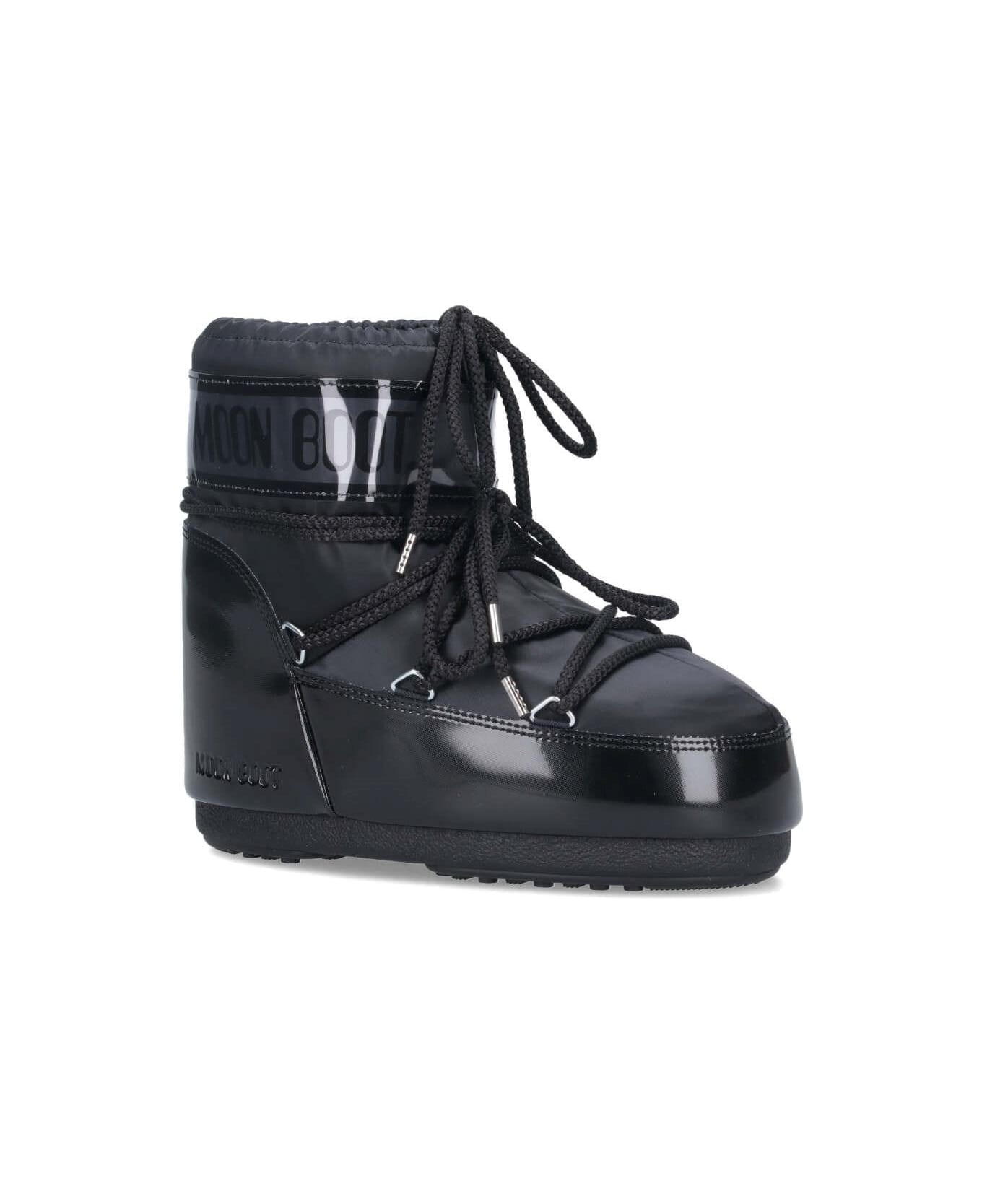 Moon Boot Icon Low Glance satin ankle boots in black fabric with tone-on-tone details, waterproof and padded design, round toe, tubular laces, embossed logo on the side, embossed logo on the back, logo top band, adjustable top drawstring, slip-on fit, non-slip rubber sole.