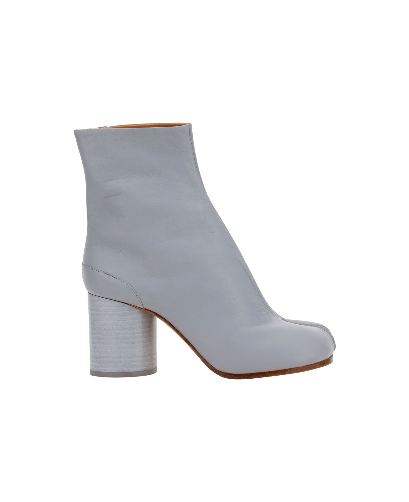 Calfskin tabi ankle boots by maison margiela, brand's iconic tabi toe on front, hook-and-eye closure on inner side panel, matching cylindrical heel, ankle height.