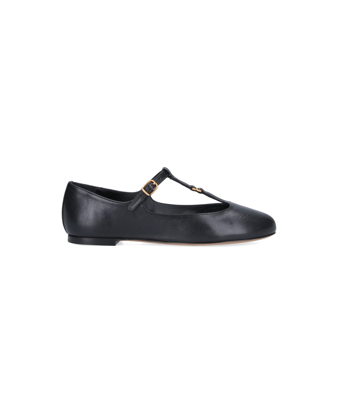 Mary Jane 'Marcie' Chloé in black nappa leather with almond toe, adjustable top strap, Gold buckle strap detail, slip-on fit, leather sole. Composition: 100% Goat Leather