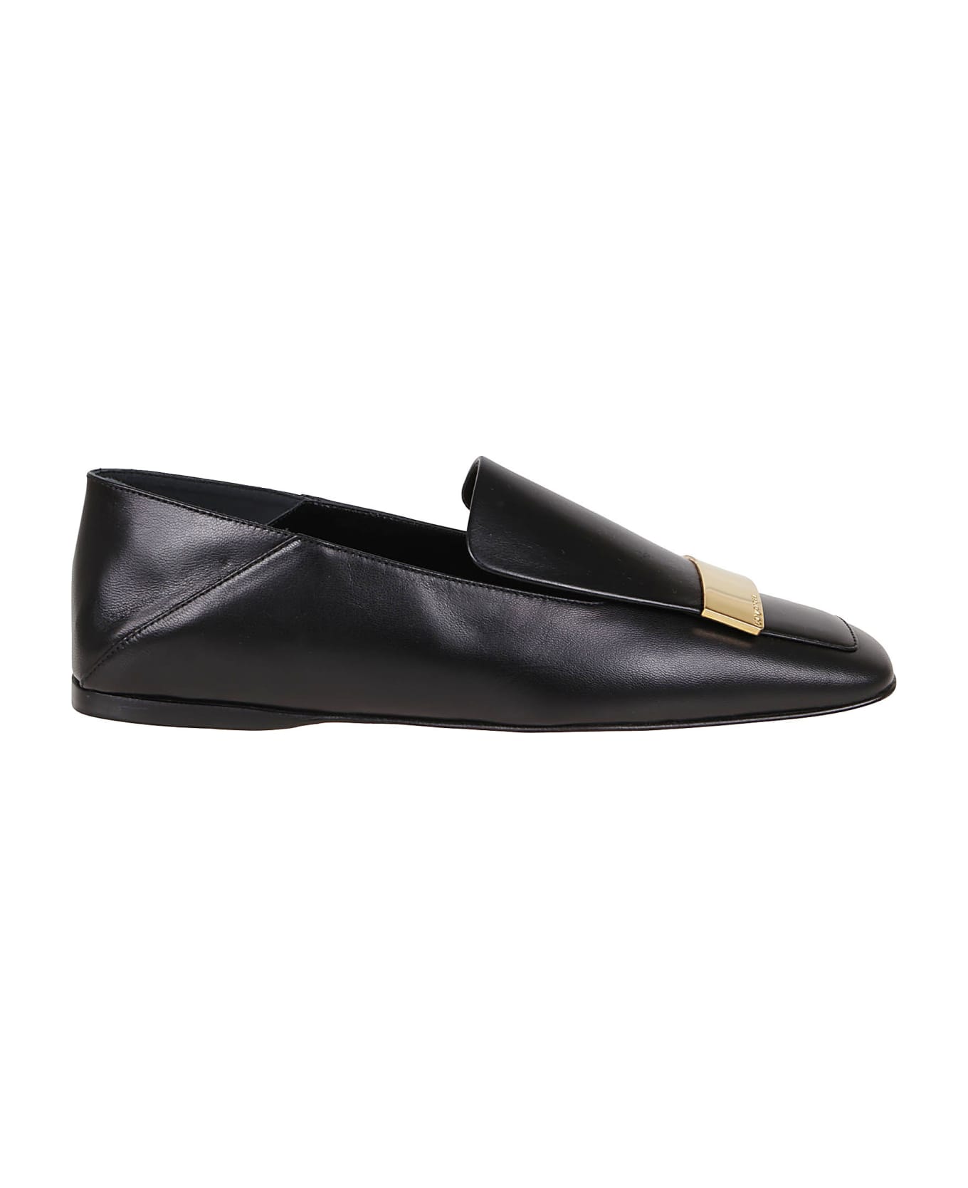 Black lamb nappa sr1 flat slipper BY SERGIO ROSSI. Square toe embellished with a contrasting gold metal logo plate. Ideal to be worn for a casual outfit, but at the same time feminine and trendy!