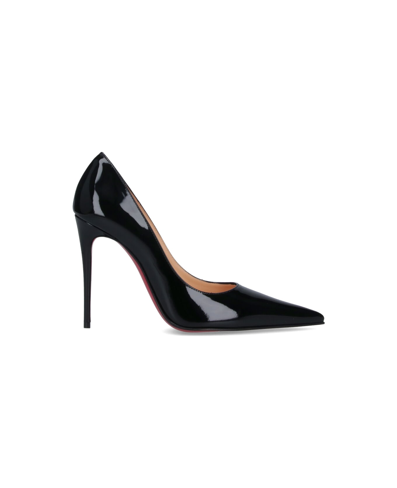 Christian Louboutin 'Kate 100' pumps in black patent leather with pointed toe, slip-on fit, stiletto heel, leather sole.