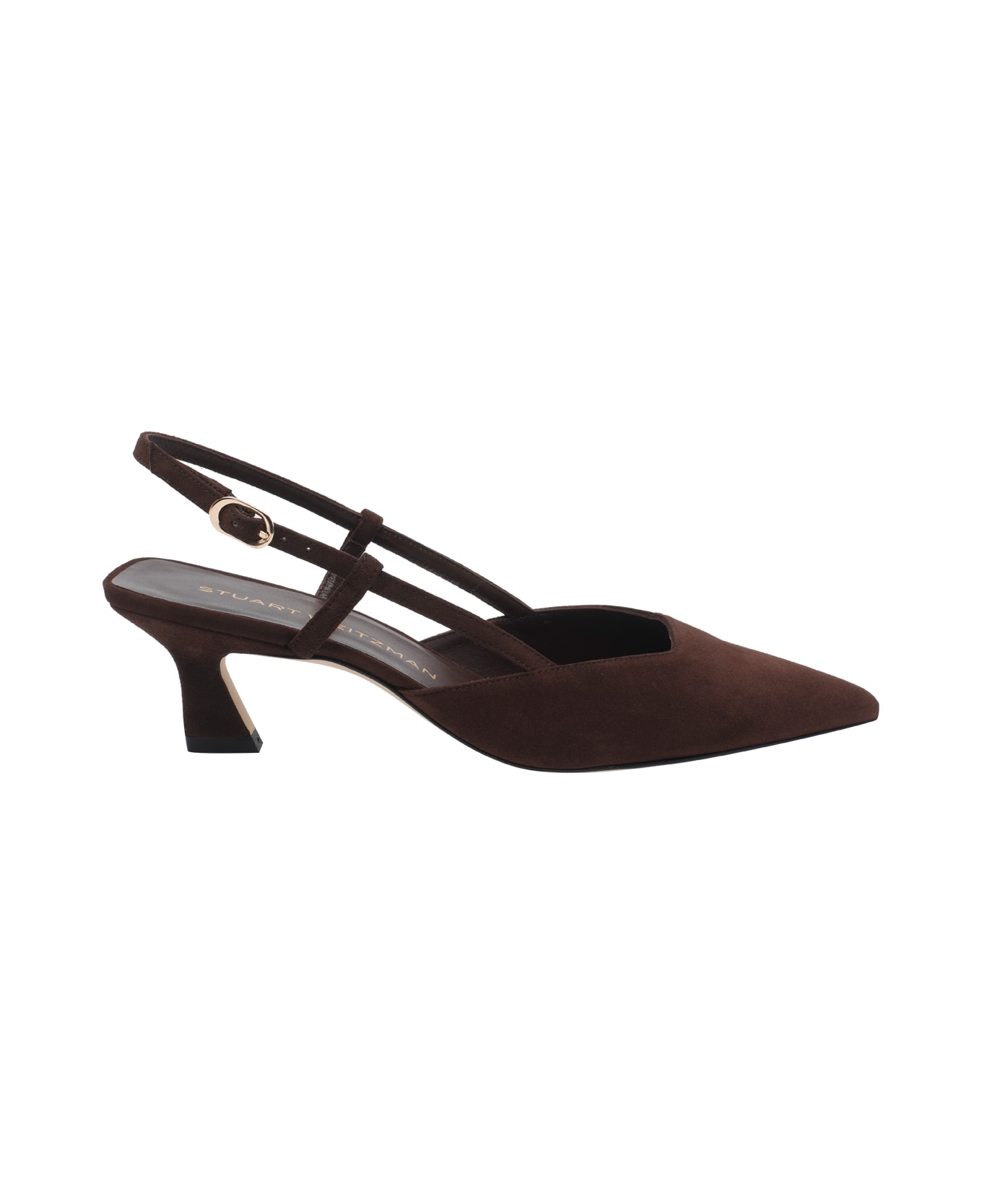 Stuart Weitzman dark brown Vinnie slingback, pointed toe, suede model, lateral buckle closure