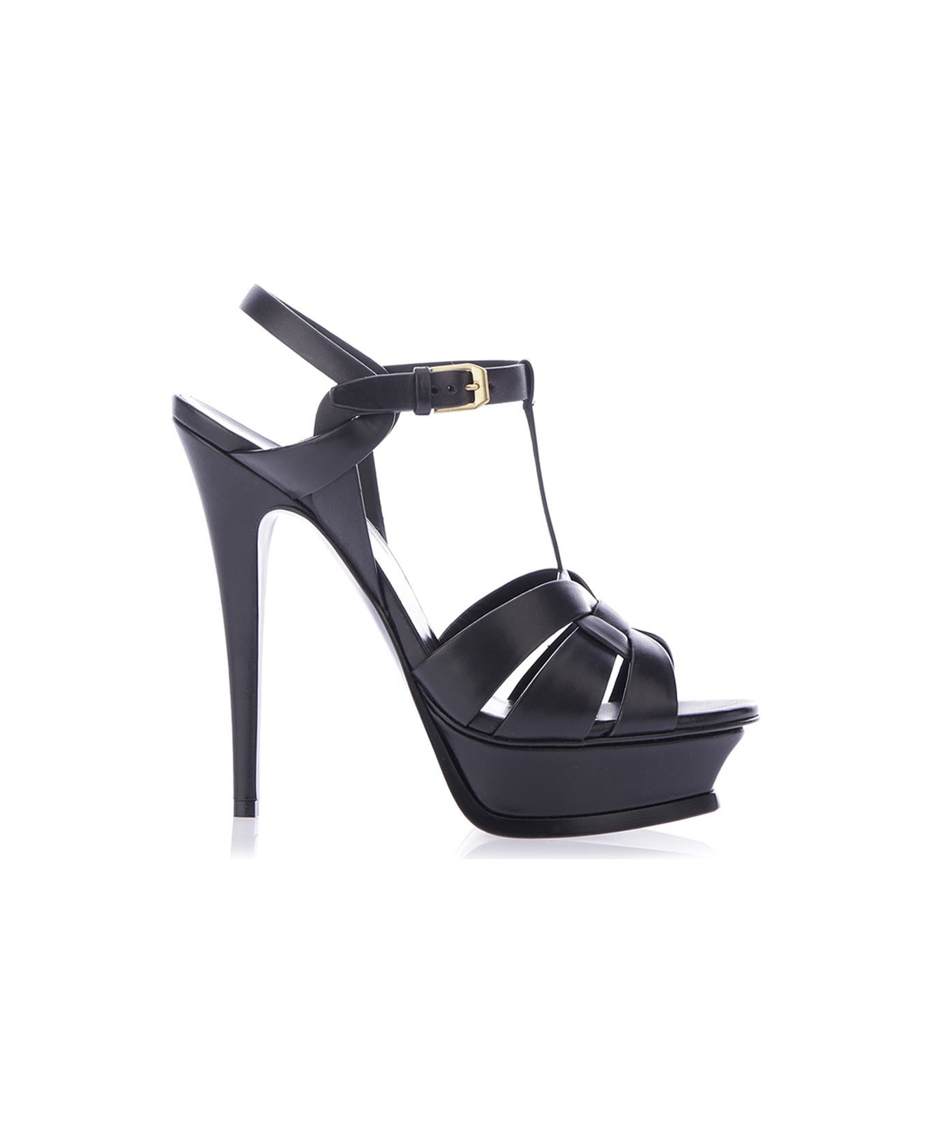 Black leather "Tribute" sandals from Saint Laurent with a T-strap to the front, an ankle strap with a side buckle fastening, a platform sole and a mid high stiletto heel.