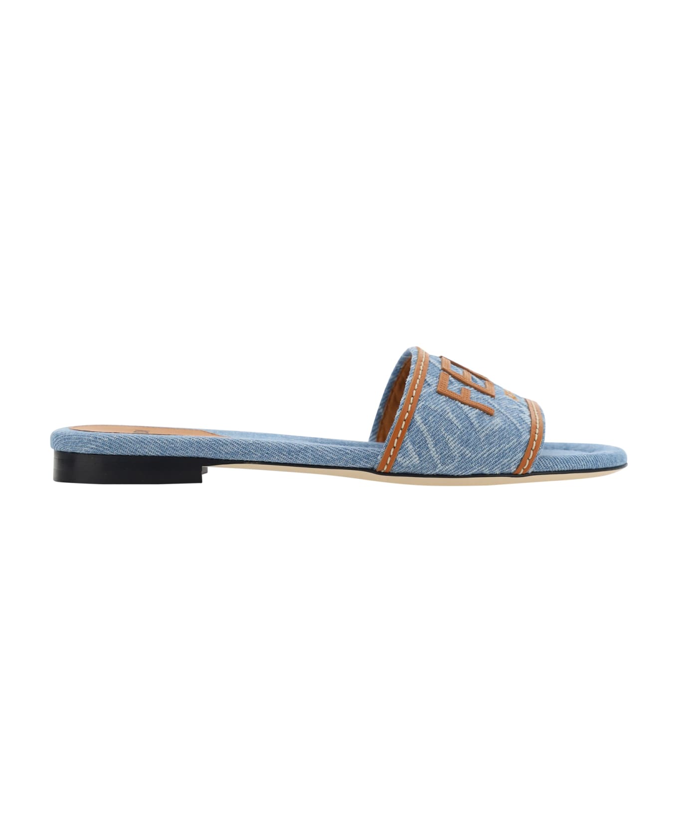 Denim+brandy Denim Sandals from Fendi Cotton denim sandals by fendi, flat sole, an open round toe, a front strap embellished with the brand's iconic monogram, a denim design with the brand's iconic ff logo repeated all-over, and a logo-embellished press stud insole.