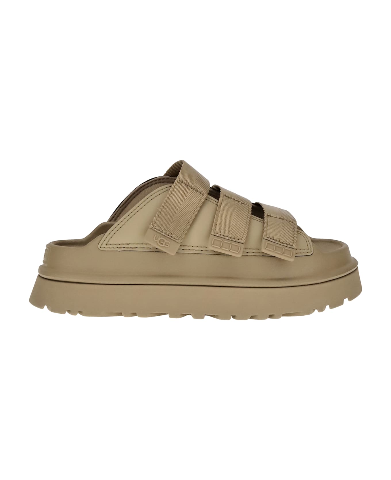 Ugg's goldenglow sandals combine comfort and style in a modern, casual design. featuring a round toe and a practical velcro strap closure, they ensure an adjustable and stable fit. the platform sole gives height without sacrificing comfort, while the branded insole completes the model with an iconic touch.