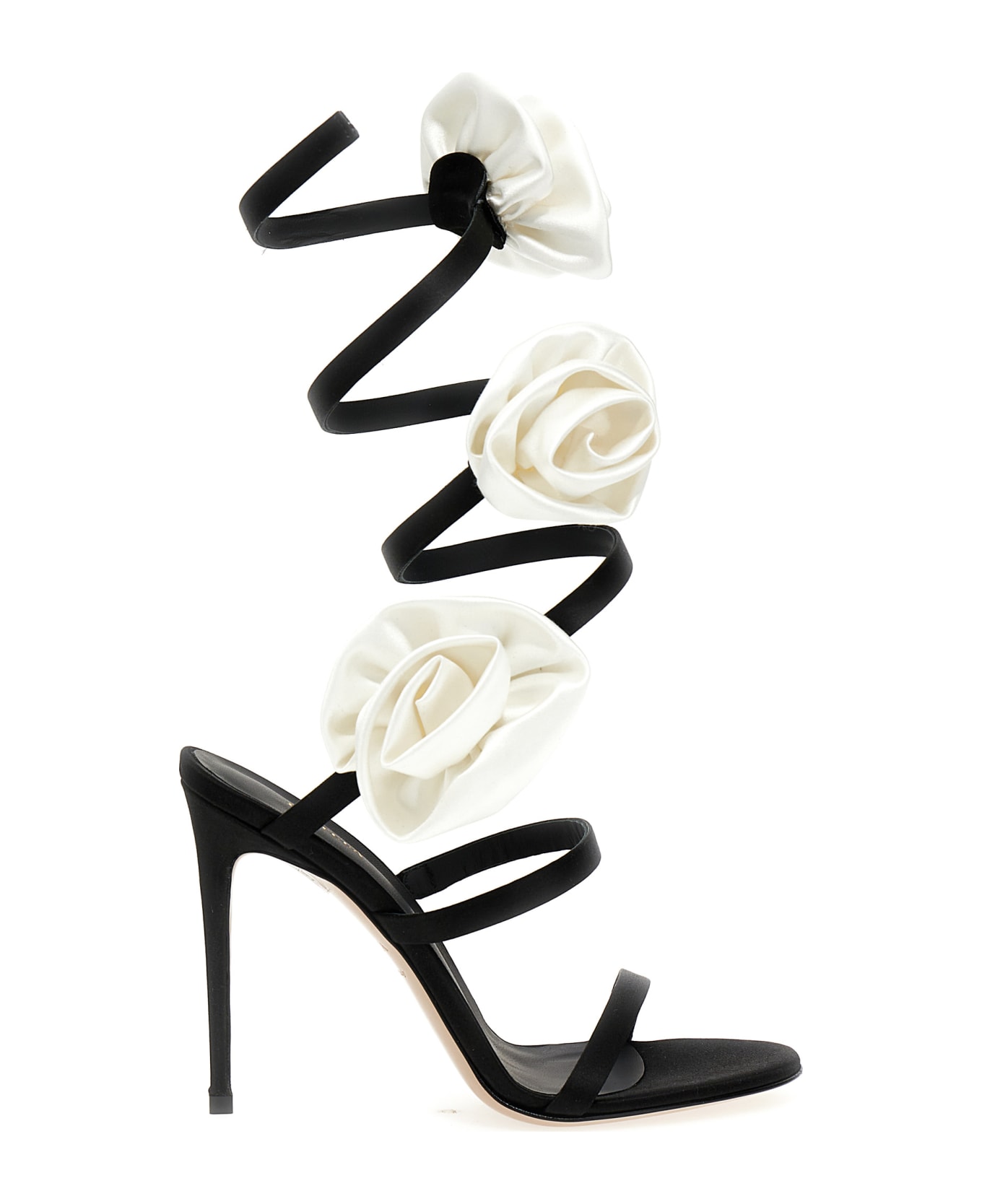'Rose' satin sandals with contrast rose appliqués, straps twisted around the ankle and stiletto heels. eels.