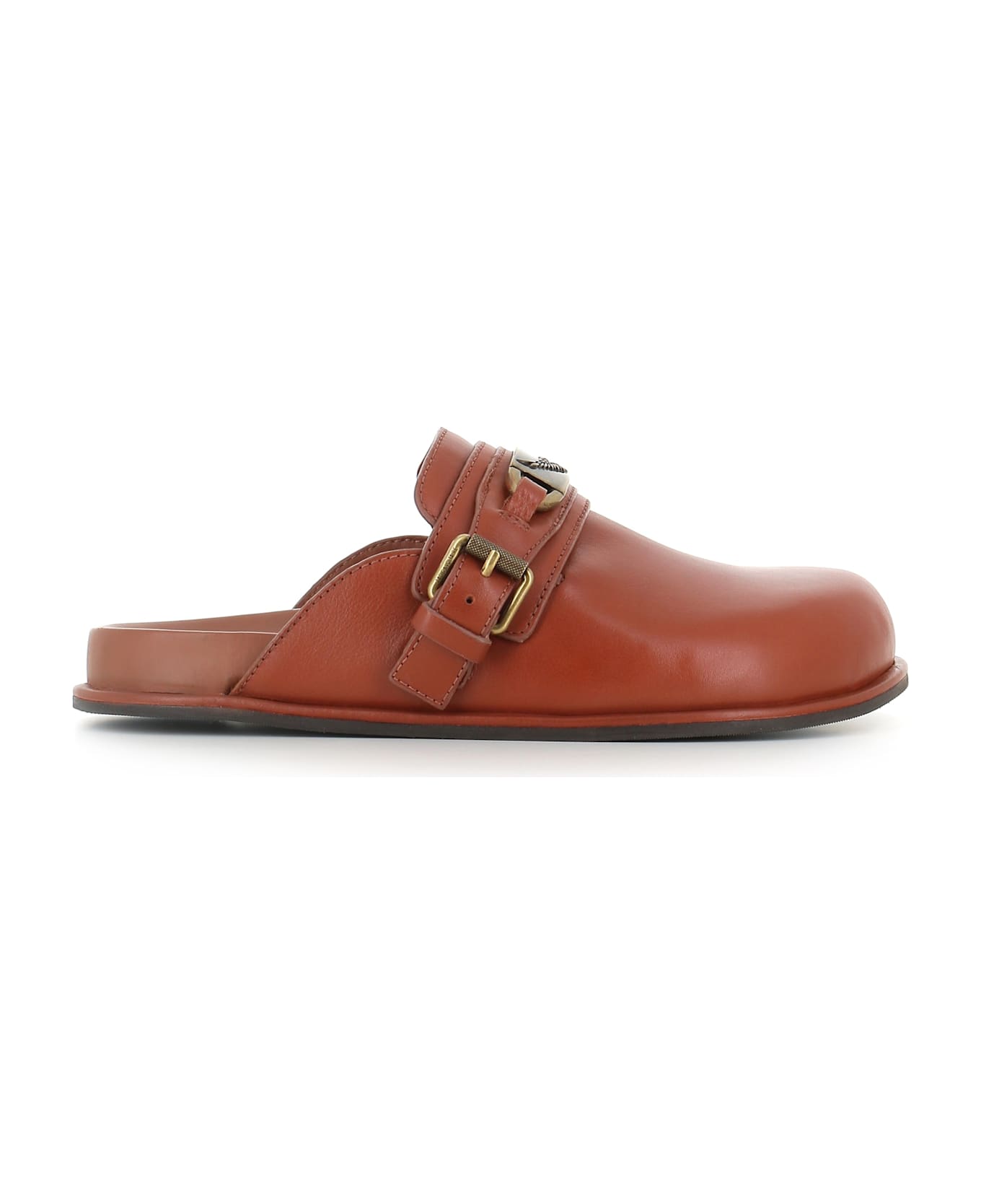 Tan leather Sabot by Zadig & Voltaire, featuring by burnished plate with wings logo and a decorative buckle. Rubber sole. Lined interior. Heel: 3 cm