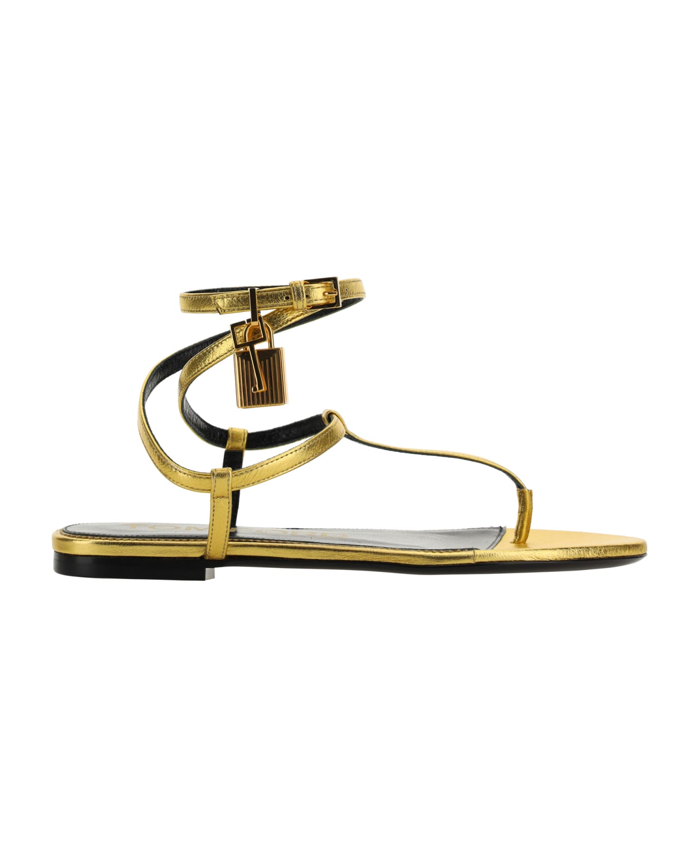 Calfskin sandals by tom ford, flat sole, flip-flop style, ankle lap strap closure with adjustable metal buckle, all-over gold-plated design. Composition: 100% % Calf Leather Bos Taurus, 100% % Goatskin/hircus Goatskin