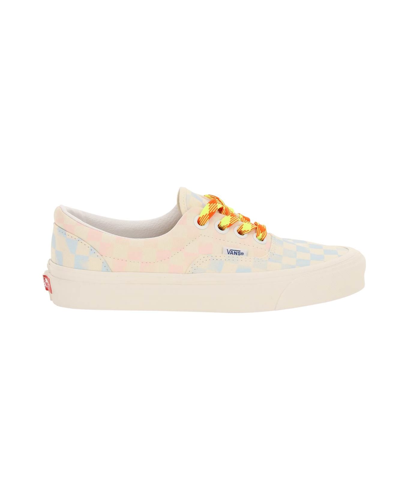 Era 95 X sneakers by Vans featuring cotton upper with pastel checkerboard print and fluorescent laces. Fabric lining with Ortholite® insole and original Waffle rubber outsole. Extra laces included.