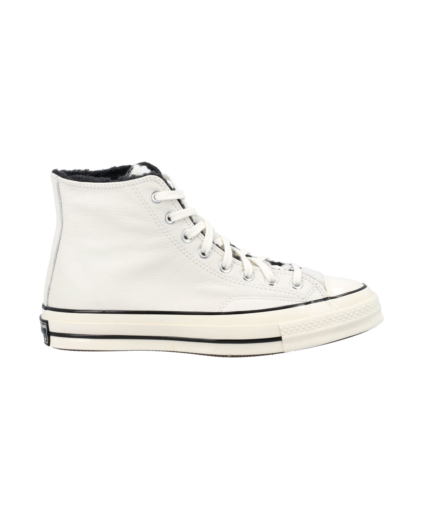 White Leather Cozy Utility Chuck 70 Hi By Converse. Featuring: Round Toe White Glossy Rubber Toe Cap Lace-up Fastening Contrast Cozy Sherpa Lining Vintage Star Ankle Patch Flat Rubber Sole
