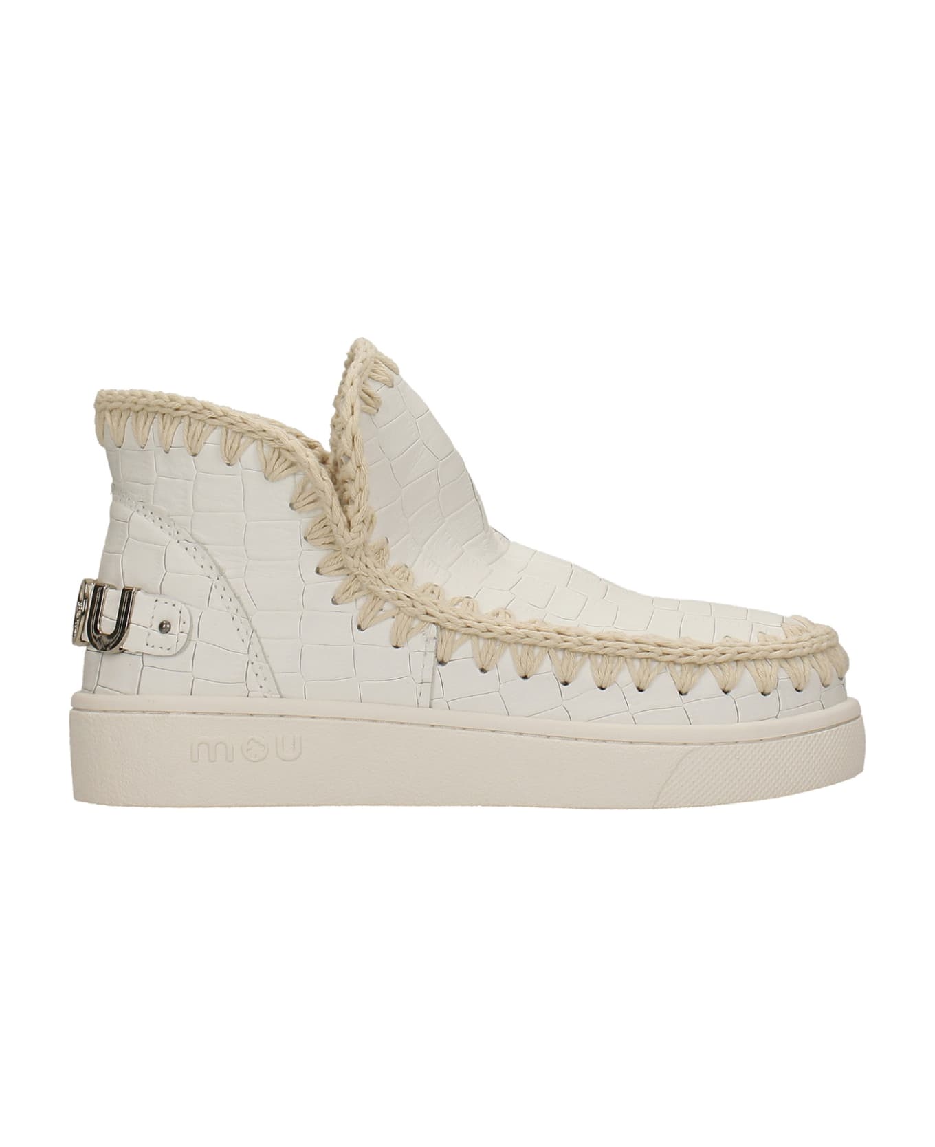 Eski New Sneaker low heels Ankle boots in white leather, contrasting stitching, metallic logo, logo on heel, Made in China, croccodile leather effect, rubber outsole