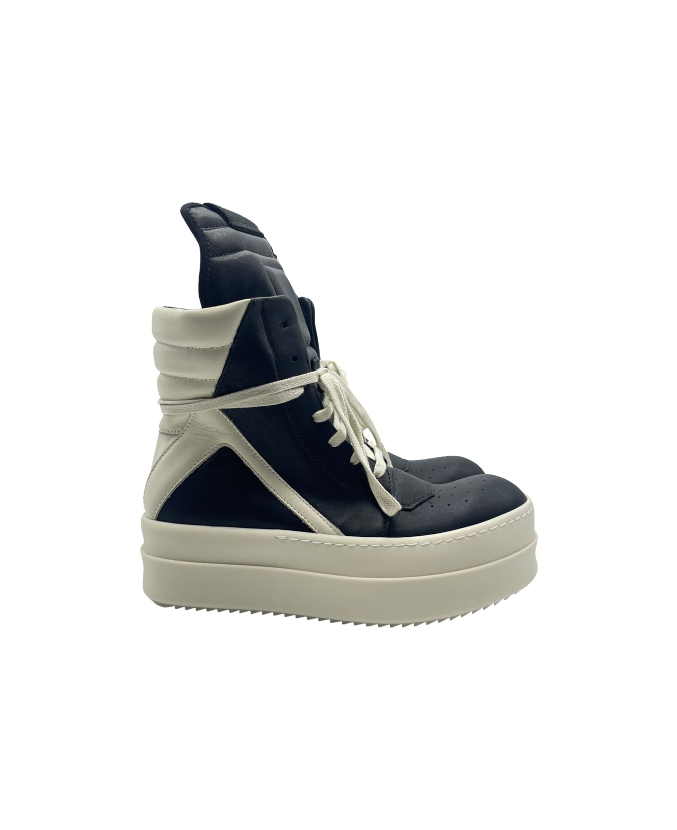 Rick Owens Porterville mega bumper Geobasket in black and milk color, full grain calf leather, above -ankle height, zipper on the inside. GTIN code: RP02D3868