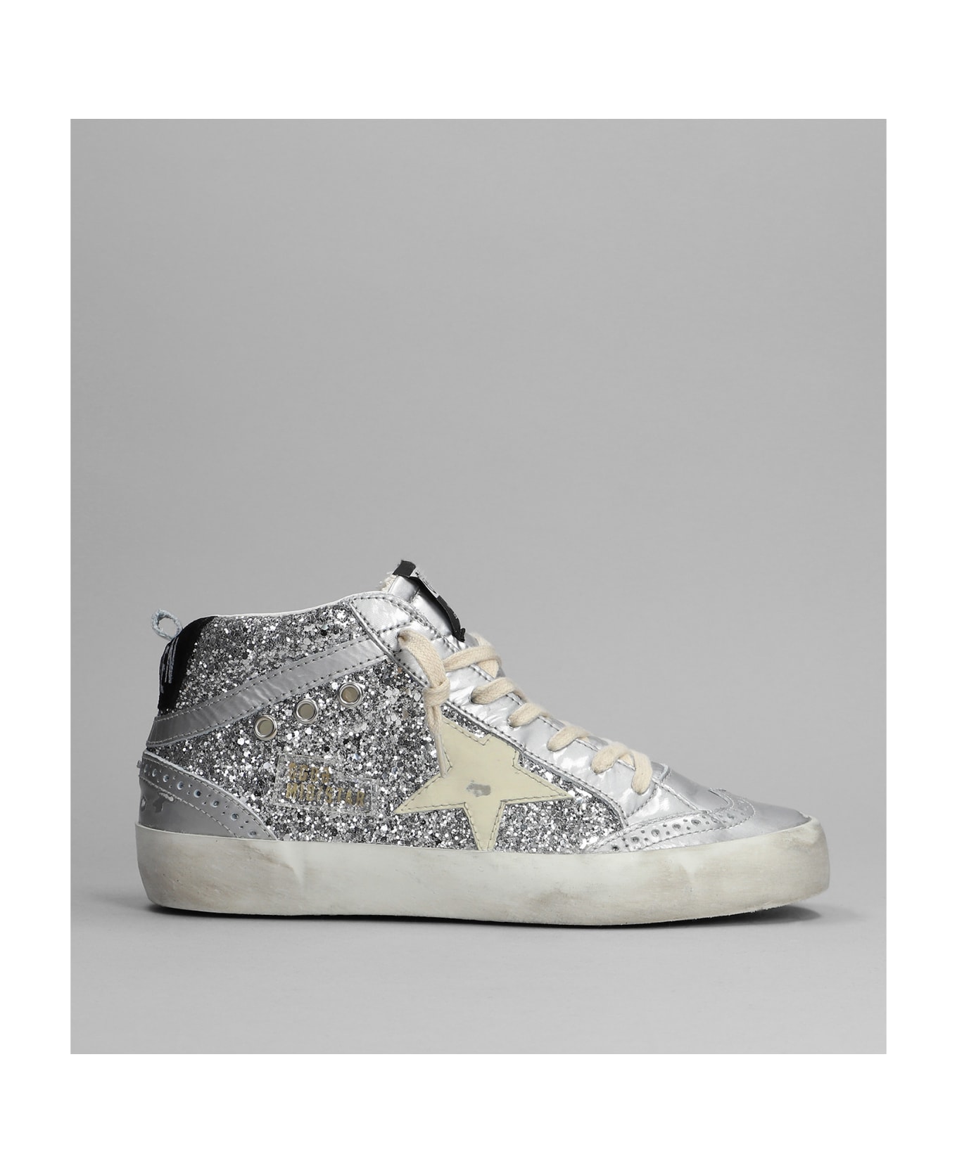 Mid Star Sneakers in silver glitter, laces, logo on tab, star detail, glitter detail, rubber outsole, Made in Italy